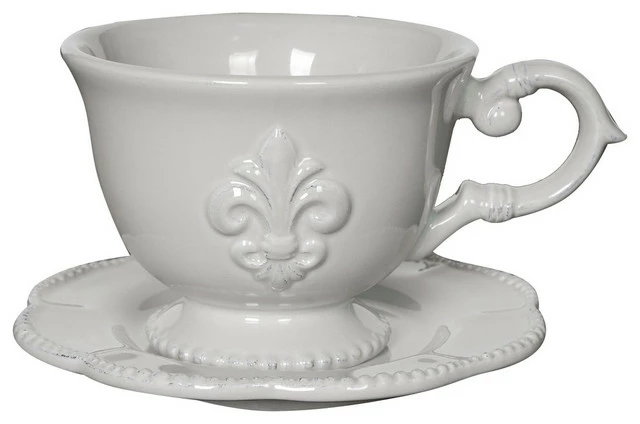 With the embossed fleur-de-lis design this gorgeous ceramic cup and saucer set is elegant enough for formal entertaining, simple enough for everyday use. Measures cup: 5.5″x4.5″x3″, saucer: 5.5″ in diameter. Comes With 4 Complete Sets. 4 Cups and 4 Saucers.