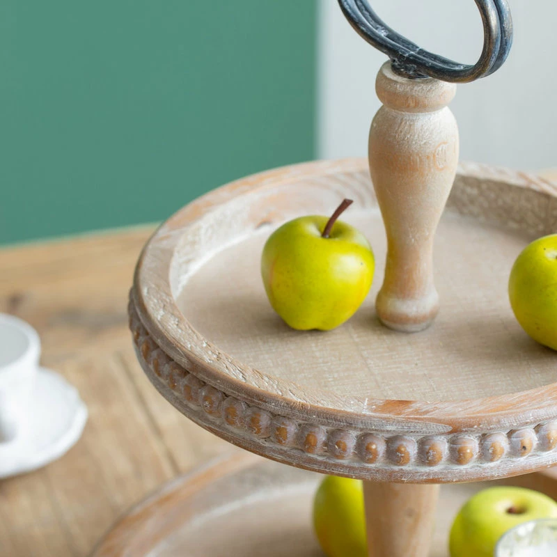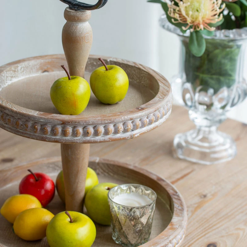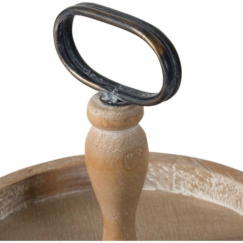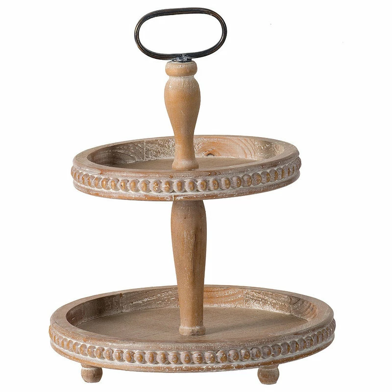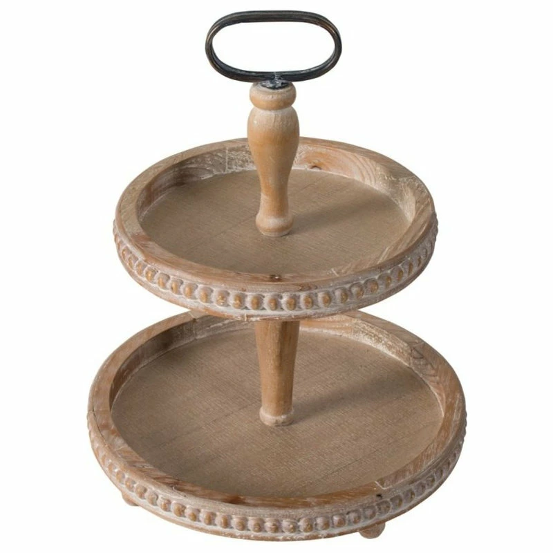 This 2 tiered tray takes the classic form of a pastry tower,and comes detailed with a wood bead trim.A metal handle at the top completes the design,which displays mementos and decor alike.The multiple tiers of this piece is sure to diversify your decor with its elevated look.Made of 65% Mdf,20% Firwood,10% Plastic,5% Iron.Measurement:13.8×13.8×16.9(Inches).Weight:3.5lbs.