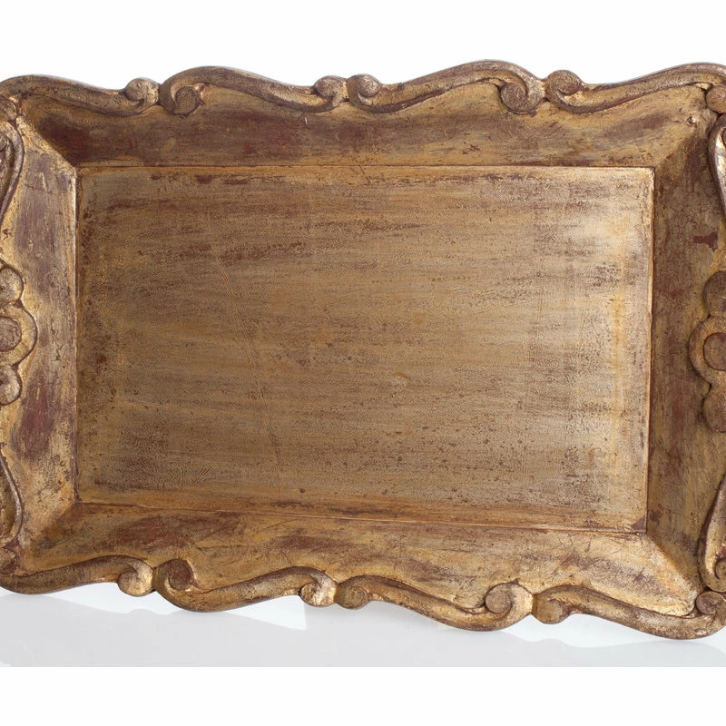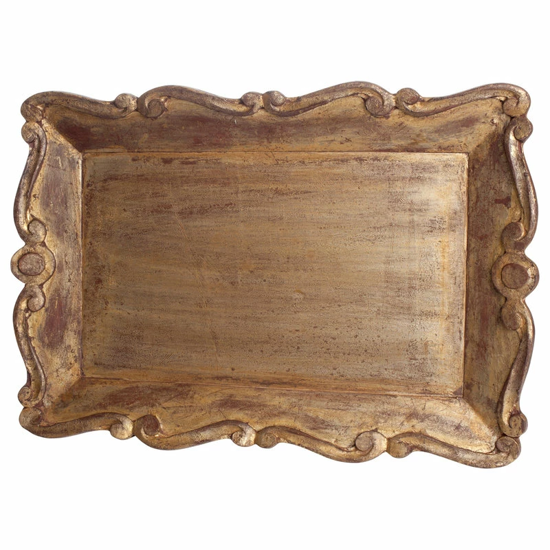 This nice tray has an old world feel as most of the applied gold leafing has been removed. A nice scalloped wooden cornice surrounds the rim. Alcohol and water resistant.