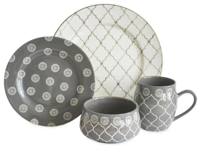 Inspired by tile work from Morocco, the Moroccan 16-Piece Dinnerware Set features mixed patterns and has a gray finish. It adds a stunning layer to any table and will give your meal a global feel.