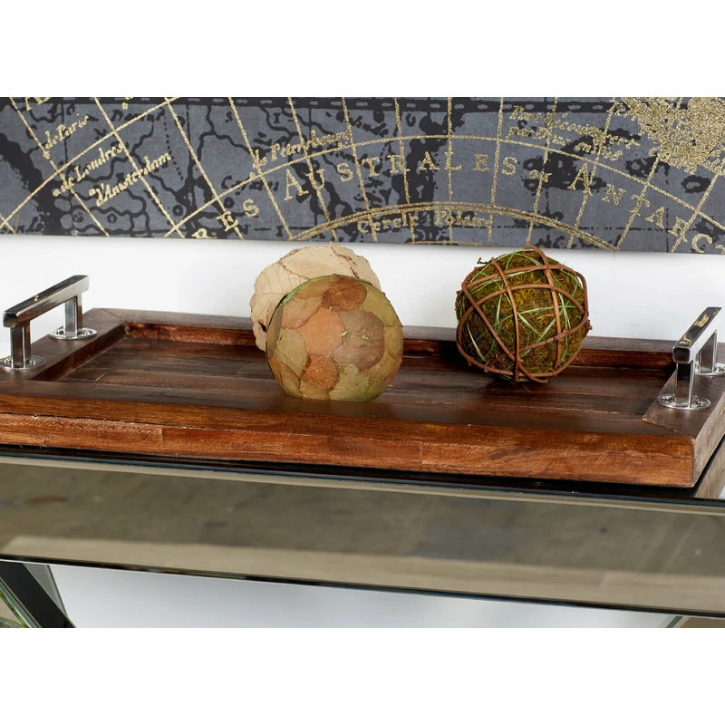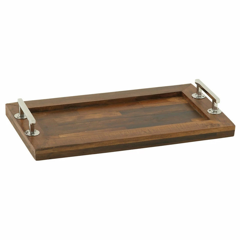 22″ New Traditional wood and stainless steel rectangular tray, Cherry wood-finish slat-style mango wood, low rim edges, silver-finish stainless steel square rod handlesFeatures