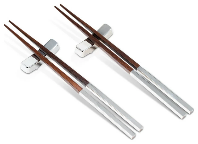 Our sleek and functional set of 2 chopsticks are the perfect addition to your dining room set. Silver plated handles comnbined with bamboo make for a beautiful set of chop sticks. In addition, two sets of rests are included in order to properly place chopsticks and avoid placing used chop sticks on a dining table. Perfect for a housewarming gift, hostess gift, and just in general a clever and sophisticated gift.