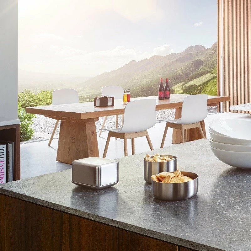No need to fetch the butter from the refrigerator. With the Lavene Butter Dish — a stylish tableside companion made of stainless steel — keep your savory condiment within reach.