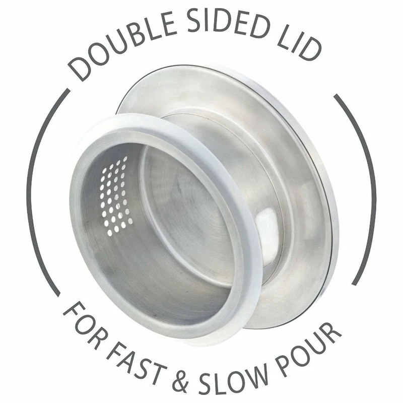 2 IN 1 one side of the stainless steel lid features an open, easy pour option while the other side features a perforated strained option, at a simple twist of the cap
