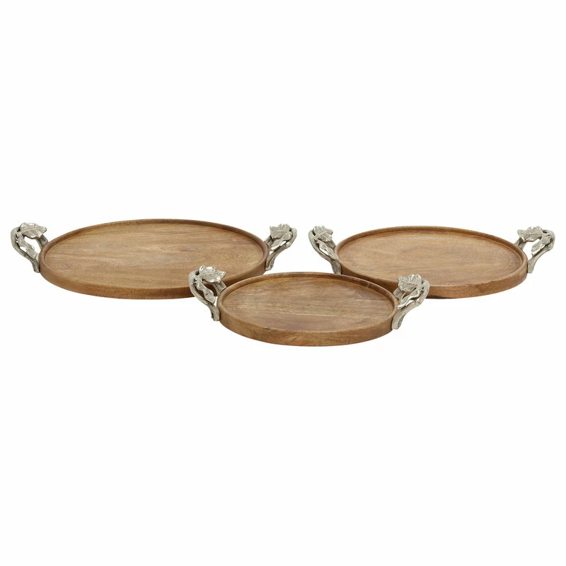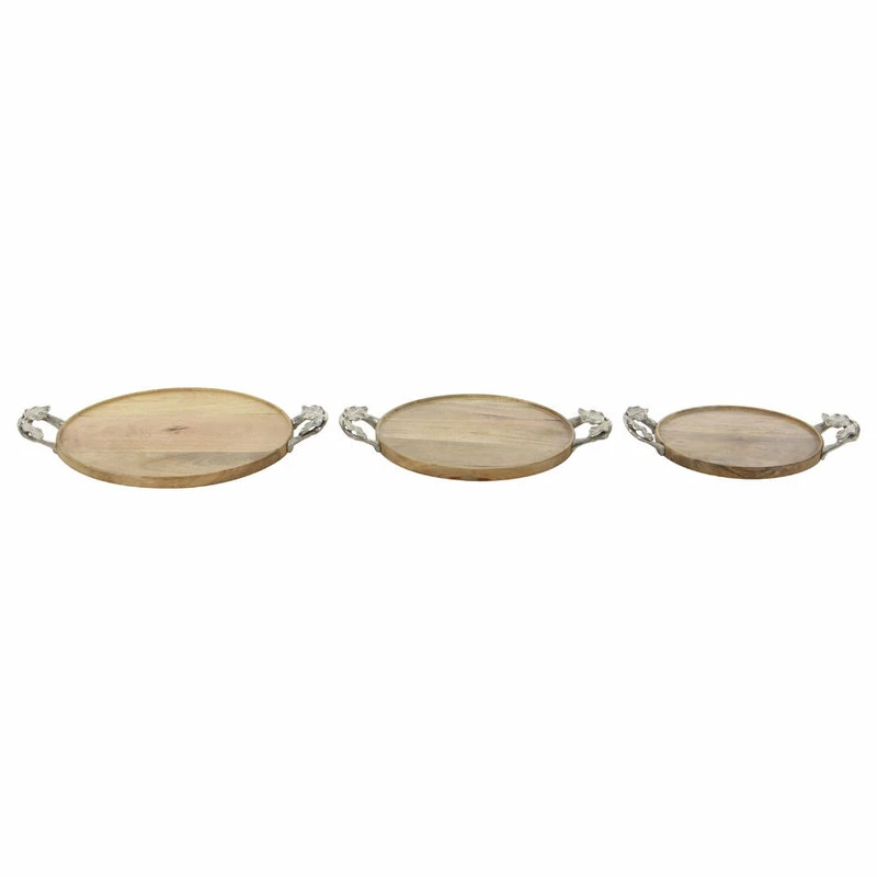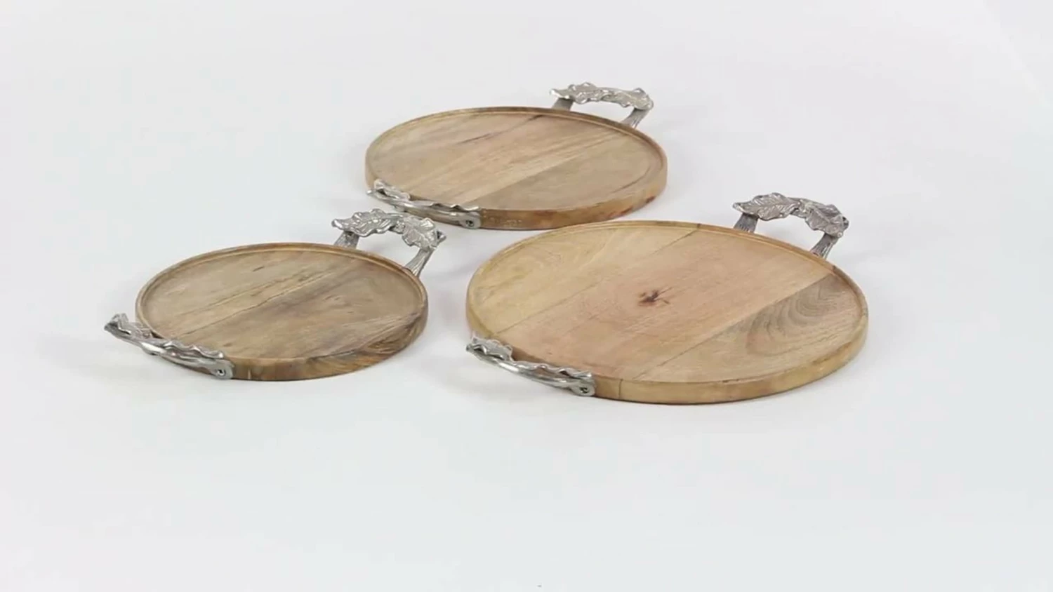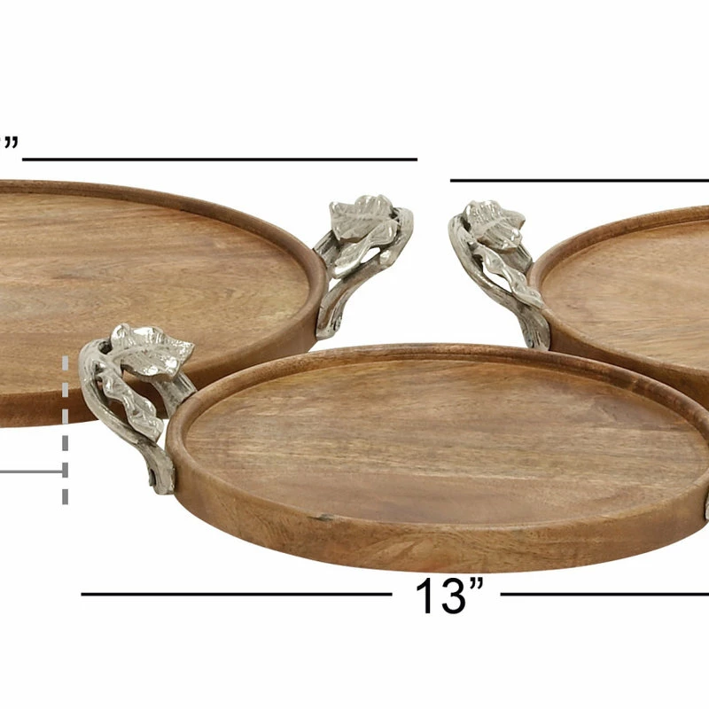 Get organizing and decorating a charming vibe with these natural wood brown trays placed in your farmhouse-themed counters or console tables. This item ships in 1 carton. Please note that this item is for decorative purpose only and is not food safe. Suitable for indoor use only. Made in India. Features a set of 3 trays with round wooden bases and metal leaf-shaped handles. Farmhouse style.
