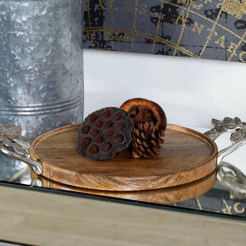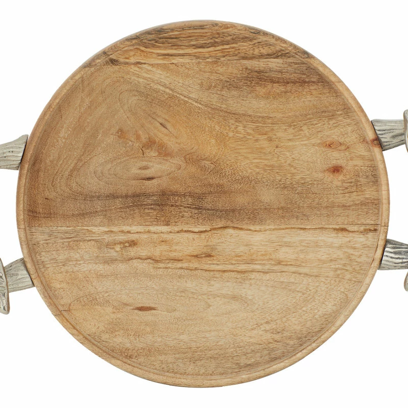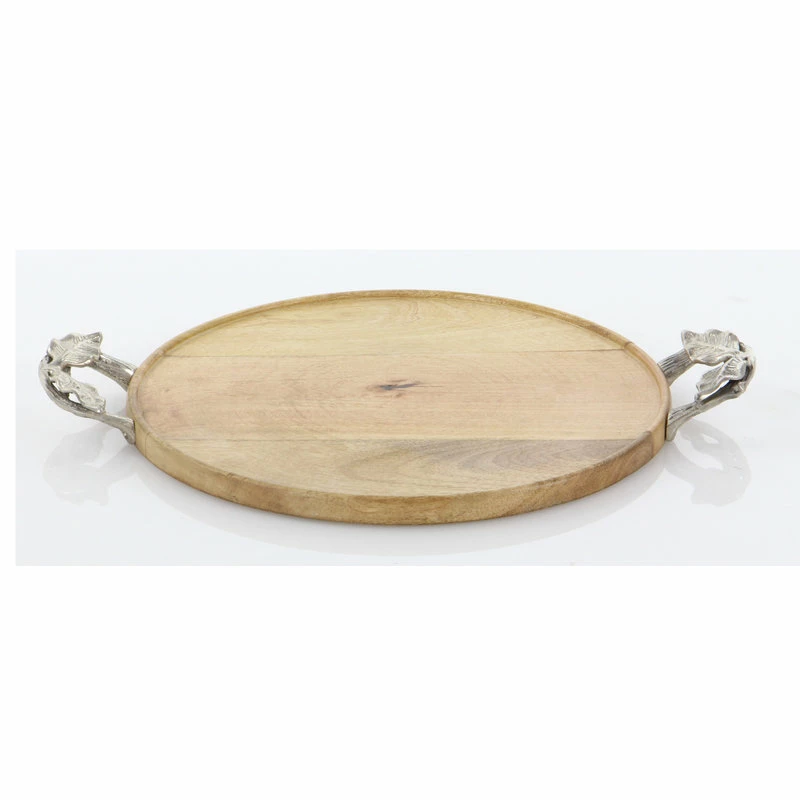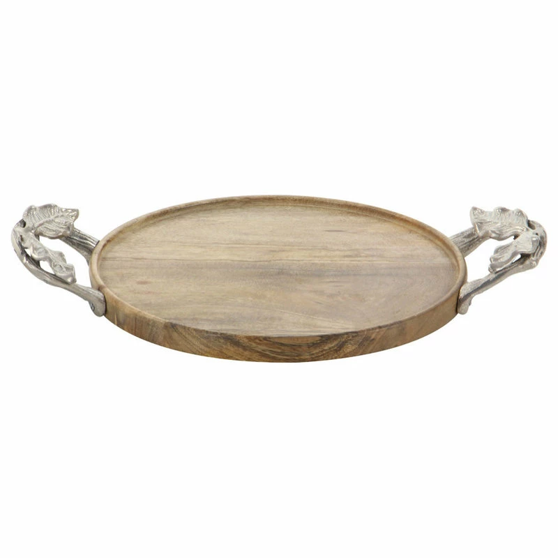 SKU: 14669 Categories: Serveware, Serving Trays, Tabletop Tags: Home decor, Kitchen decor, Round brown mango wood tray, Round brown wooden tray, Round serving trays, Round wood trays, Round wooden tray, Serving trays, Trays, Wood and metal serving trays, Wood metal tray, Wood tray metal hand, Wood tray with leaf handles, Wood trays, Wood trays with metal handles