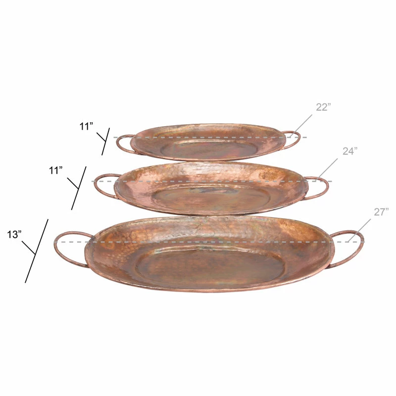 These functional oval copper trays are great decorative trays for shelves, coffee tables, dining tables, drawers, cabinets, and the bedroom. Whether in your kitchen, or on your coffee table, it’s a great way to display and store your favorite things. A storage piece that is spacious for your trinkets or decorative goods on your mantle, coffee table or kitchen counter. This item comes shipped in one carton. Please note that this item is for decorative purpose use only and are not food safe. Suitable for indoor use only. Made in India. These metal trays come in a set of 3. Rustic design.