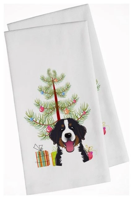 - Christmas Tree & Bernese Mountain Dog White Kitchen Towel