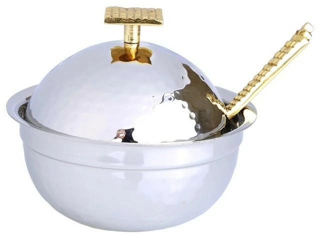 SKU: JHDM125 Categories: Serveware, Tabletop, Tureens Tags: Elegant honey dish, Holiday dish, Honey dish, Stainless steel honey dish, Two-tone honey dish