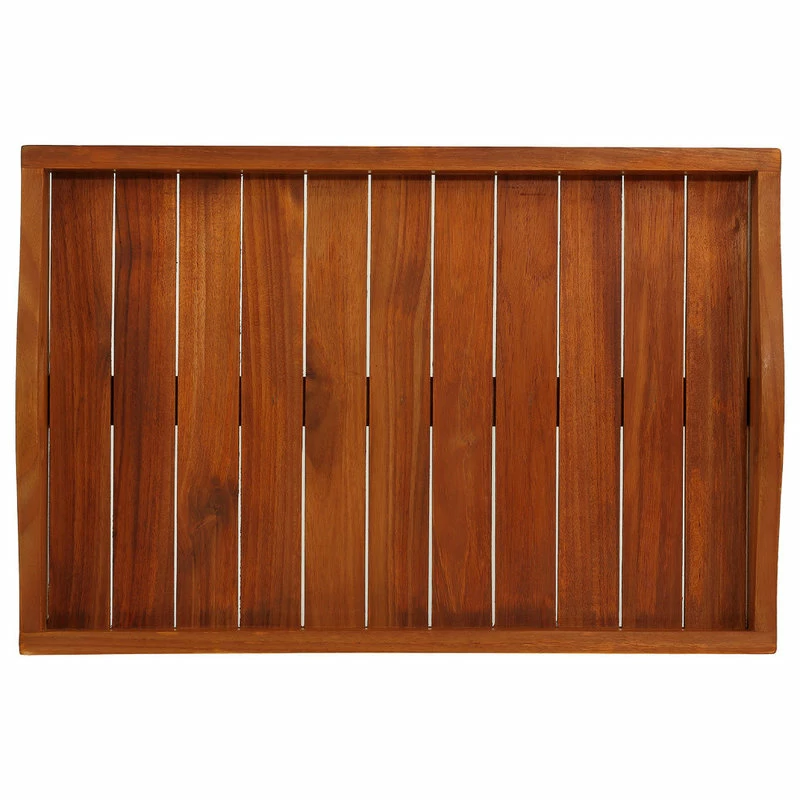 The Vivi rectangular serving tray is as versatile as it is beautiful in a teak oiled finish. Use this on a large ottoman as a coffee table or a serving tray for your outdoor needs with its easy grip handles. Can also be used as a display for towels and spa toiletries in residential or commercial spaces. Made of responsibly harvested solid teak wood (tectona grandis), it is naturally resistant to mold and mildew and is outdoor friendly.