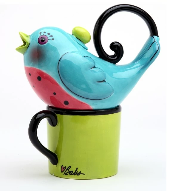 Enjoy your tea with the vibrant and charming Blue Bird Tea for One Set. This hand-painted ceramic set includes a blue bird-shaped teapot and bright green mug. Use the set for afternoon tea or formal tea parties. Holds 12 ounces. Hand wash only.