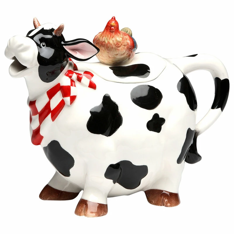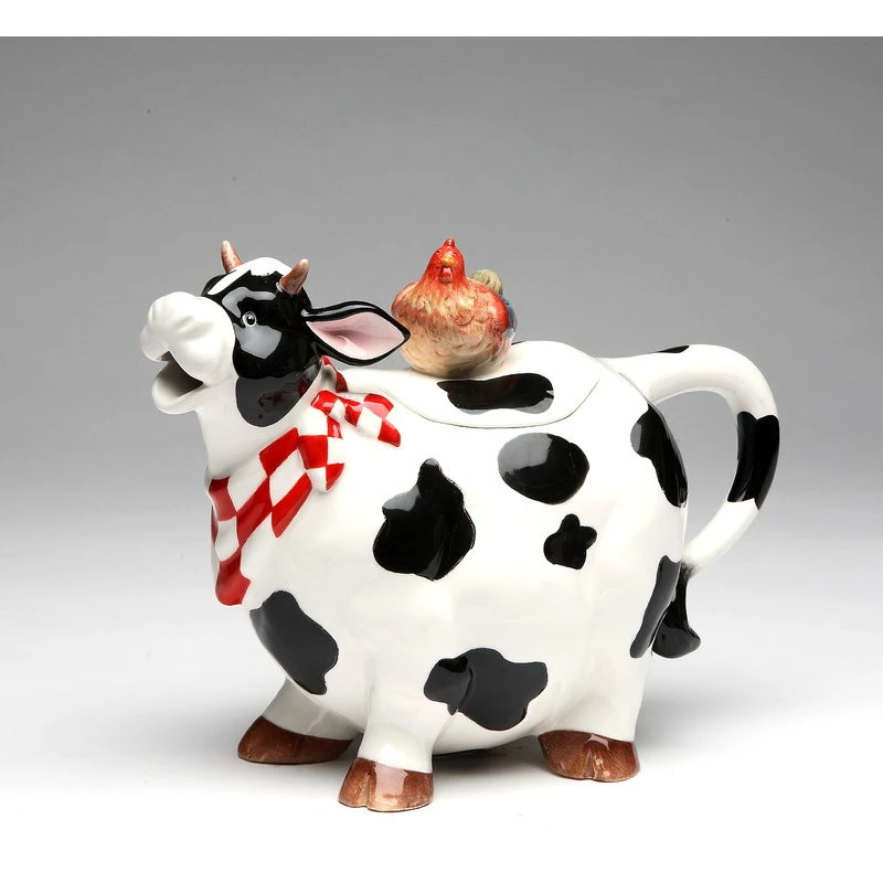 Enjoy your tea with this country style Cow Teapot. Made from hand-painted red, black and white ceramic, this cow-shaped teapot makes a charming addition to a farmhouse style kitchen. Holds 26 ounces. Hand wash only.