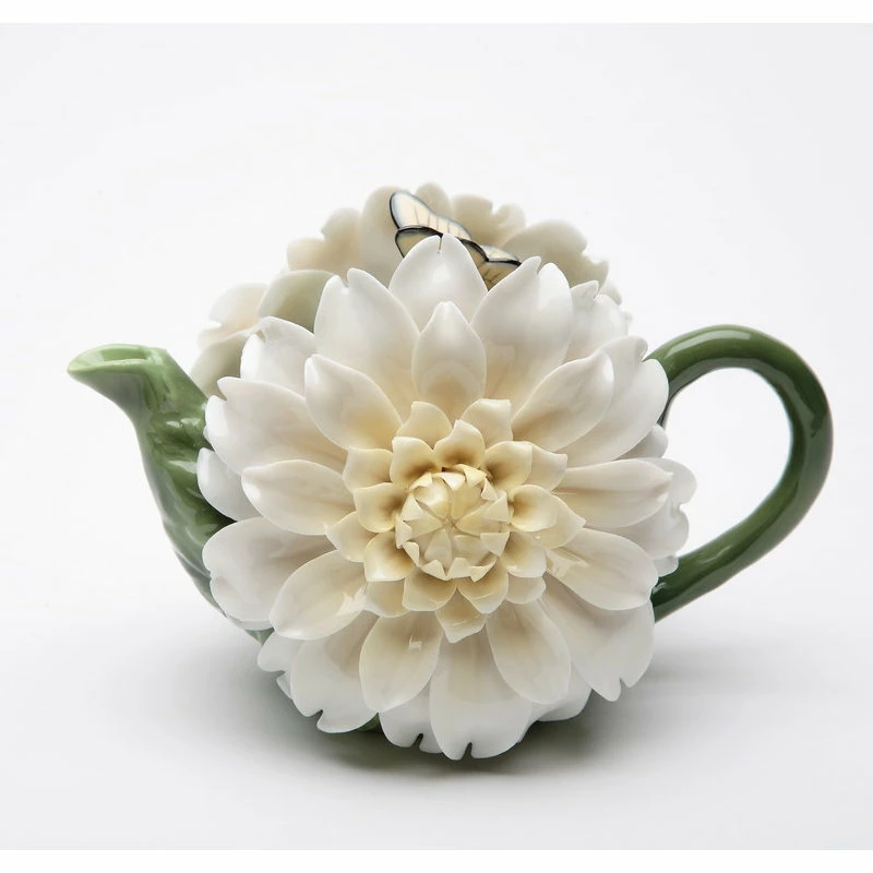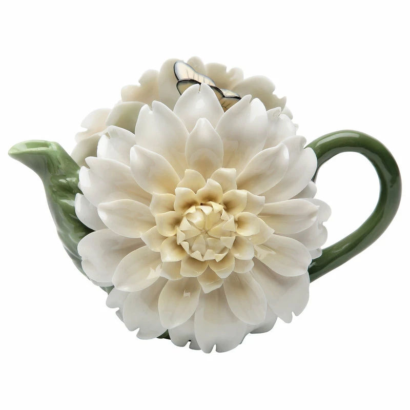 The Daisy Teapot makes an elegant addition to a tea party. This hand-painted green ceramic teapot features stunning white daisy decorations and a small butterfly ornament. Holds 8 ounces. Hand wash only.
