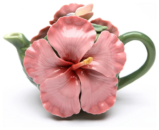 The Hibiscus Teapot makes an elegant addition to a tea party. This hand-painted green ceramic teapot features stunning pink hibiscus decorations and a small butterfly ornament. Holds 8 ounces. Hand wash only.