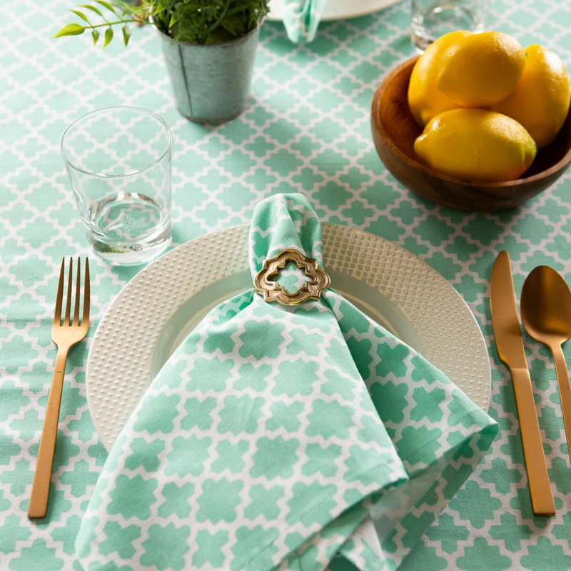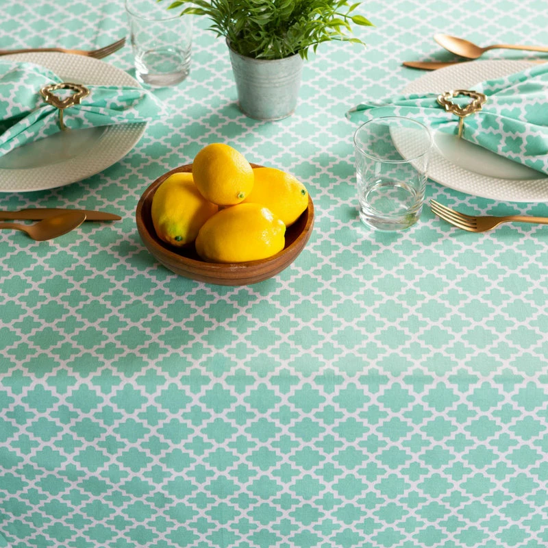 DII Aqua Lattice TableclothSee printed tablecloth size chart in images to decide on size needed for your table. 100% cotton, machine washable, gentle cycle, tumble dry low. Low iron if needed. Our cotton tablecloth provides a subtle & sophisticated impact to your dining display. The elegant and geometric lattice pattern complements any decor from classic to contemporary. A classic staple for any kind of entertaining, this cotton tablecloth will add a rich, finished look to your table. The ideal gift for Christmas, birthdays, weddings or housewarming parties as well DII offers delightful home products including napkins rings, aprons and more. Click the DII link at the top of the page to explore our collections or search “DII Tabletop”.