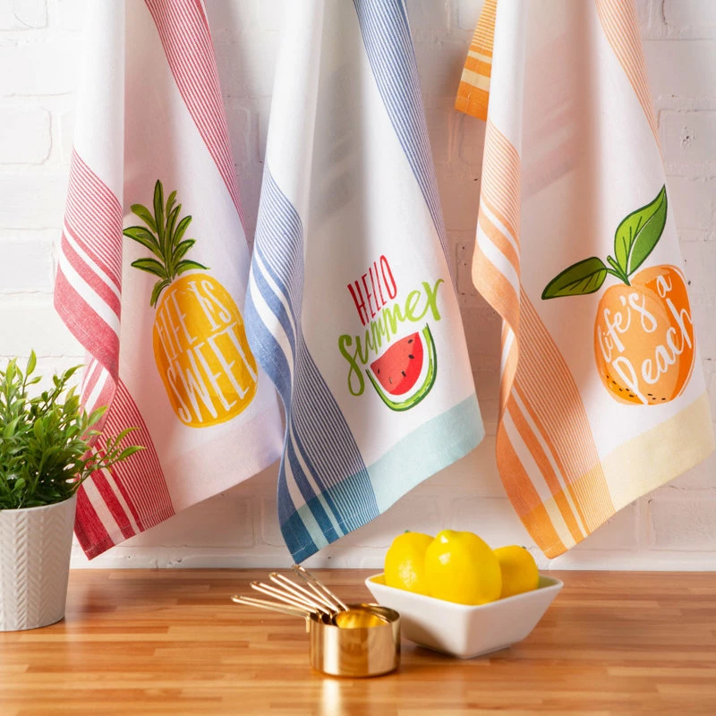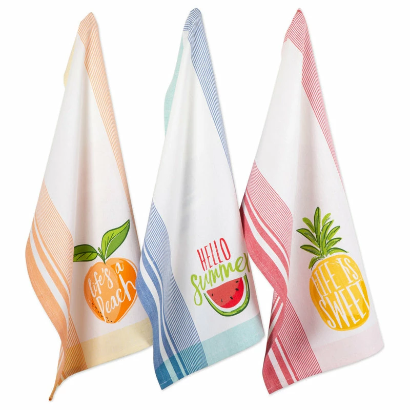DII Assorted Hello Summer Print Dishtowel (Set of 3)Each set includes 3 dishtowels measures 18×28″ to tackle all of your drying and cleaning kitchen tasks. Cotton Fabric, Machine Washable. Wash with Cold Water in Gentle Cycle & Tumble Dry Low. Do not bleach them or run them through a hot dryer The festive design coordinate with most kitchen decor to add holiday joyfulness to your kitchen This easy care dishtowels come with multiple colors, perfect Mother’s Day, holidays, housewarming and hostess gifts. DII offers delightful Home and Kitchen products, for more options search “DII for the Home”.