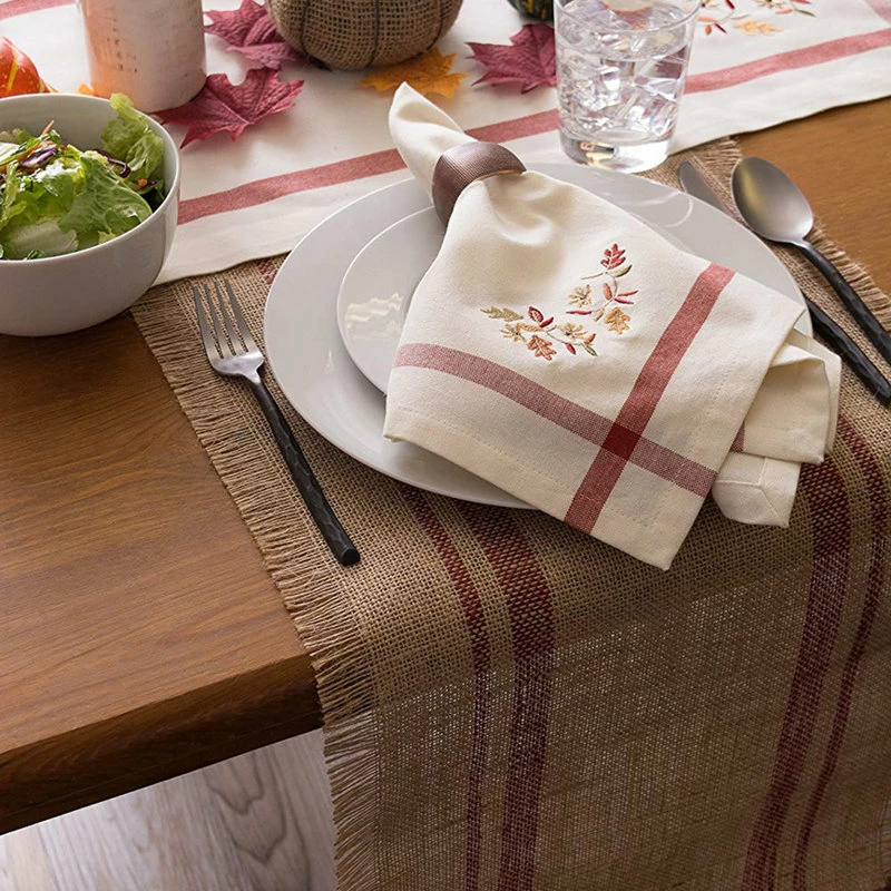 DII Barn Red Double Border Burlap Table RunnerThis table runner measures 14×72″ in size, appropriate for a table that can seat 4-6 people. 100% jute/burlap, shake briskly and wipe with damp sponge or cloth. Adorn our neutral table runner with lace, ribbon or fabric paint to suit your occasion or keep it simple shabby-chic. Set in the foyer or on entryway tables for a warm and earthly welcome all year round! DII offers delightful home products including matching cloth napkins, napkin rings, placemats and tablecloths. Click the DII link at the top of the page to explore our collections or search “DII Table Tops”.