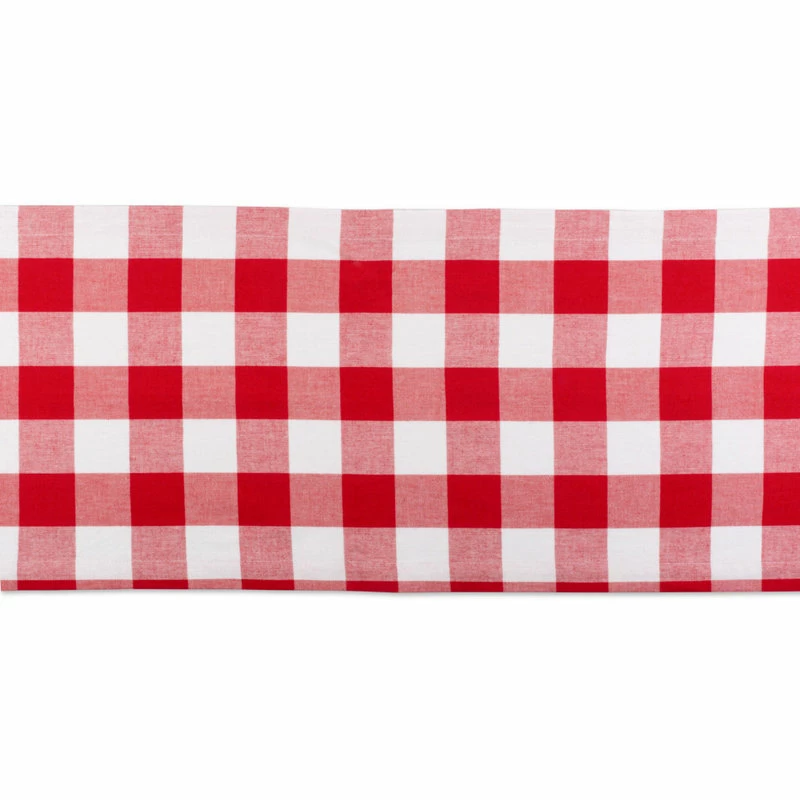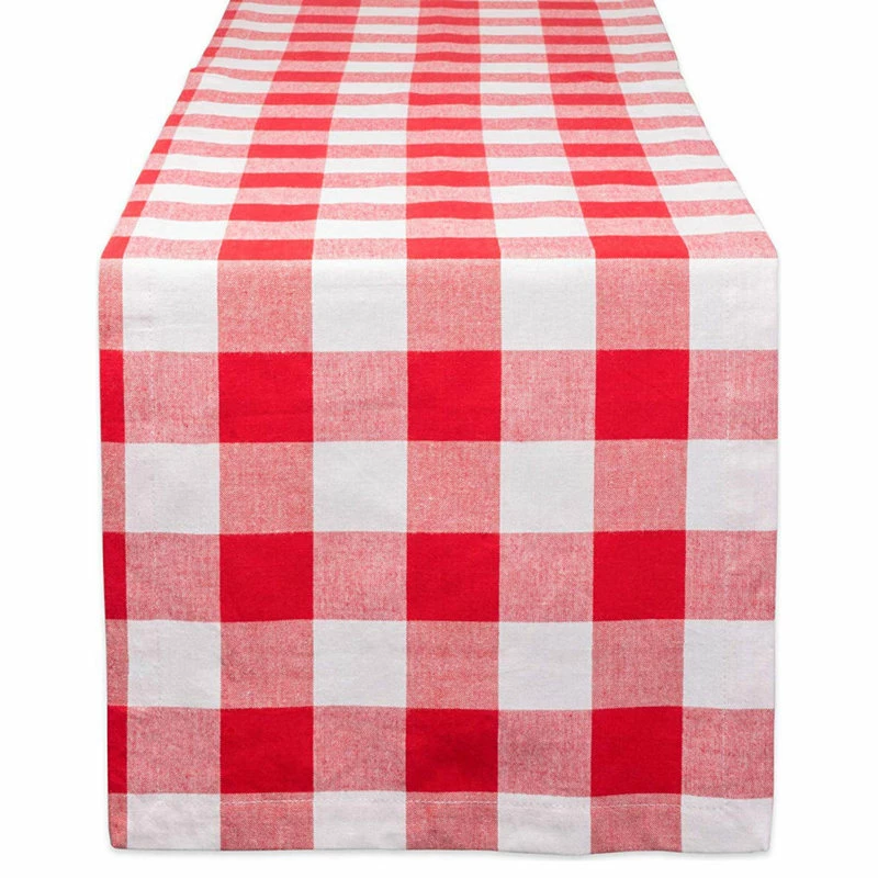 DII Red & White Buffalo Check Table RunnerMeasures 14×72″, appropriate for a table that can seat 4-6 people. 100% cotton fabric, machine wash with cold water on gentle cycle & tumble dry low. Do not bleach them or run them through a hot dryer. Our table runners are available in an assortment of colors and coordinate with our dishtowels, aprons, oven mitts, pot holders, napkins, and tablecloths – own the whole collection. Decorative pieces like our table runner can spruce up dining, foyer, console or coffee tables while still showing off the surface of furniture. Set plants or other centerpieces atop our durable and long lasting table runner to update any space. DII offers delightful home products including charming napkin rings, placemats and tablecloths. To locate the matching napkin ring in the photo search – DII Napkin Ring Set.