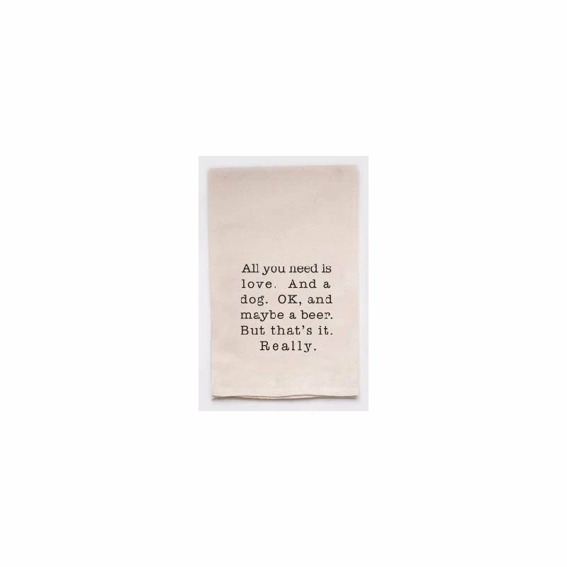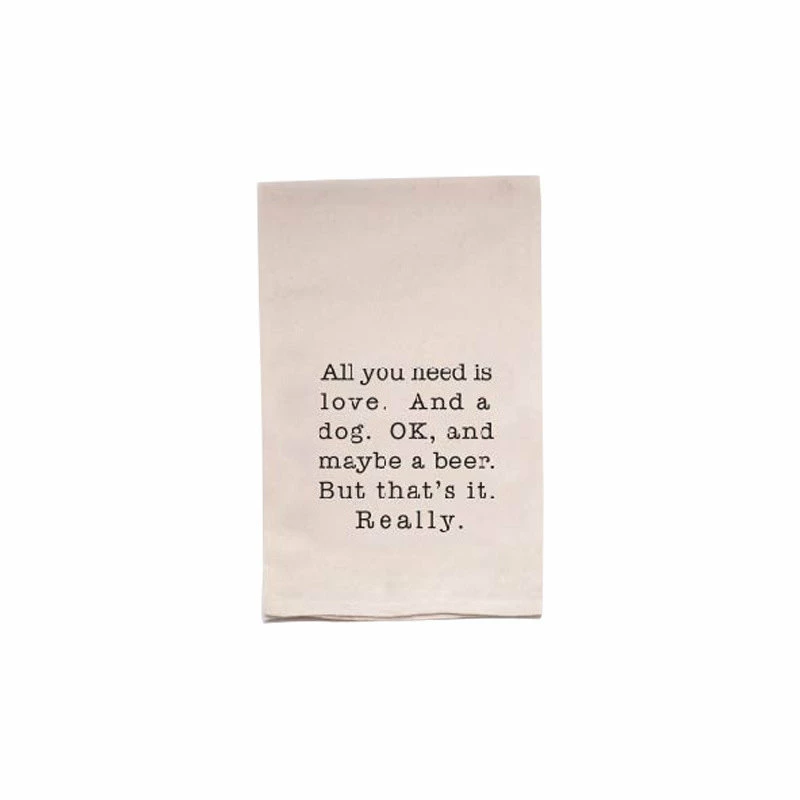 - This listing is for one tea towel that says: All you need is love. And a dog. Ok, and maybe a beer. But that’s it. Really.