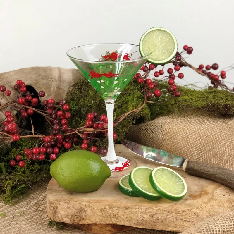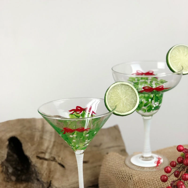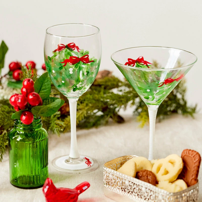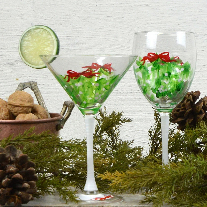 Each of our martini glasses are unique and special. Carefully and lovingly hand painted by the Artistic Team at Golden Hill Studio. Our Mistletoe Collection features pretty red berries on mistletoe branches and will make your favorite martini recipe taste even better! Put it over that special person’s head for a Mistletoe Kiss! Golden Hill Studio is not just about fine glassware but about fine living!
