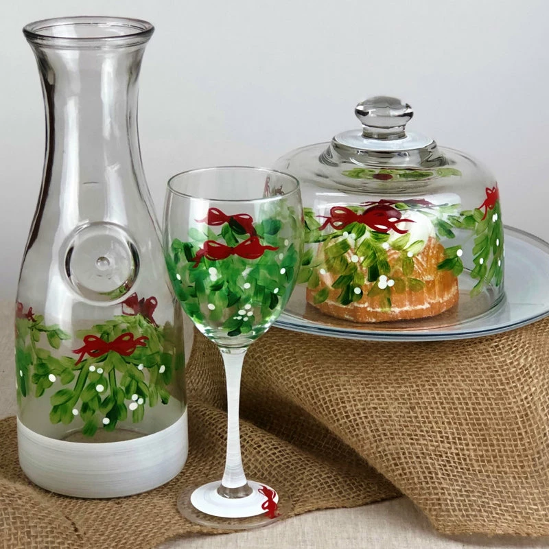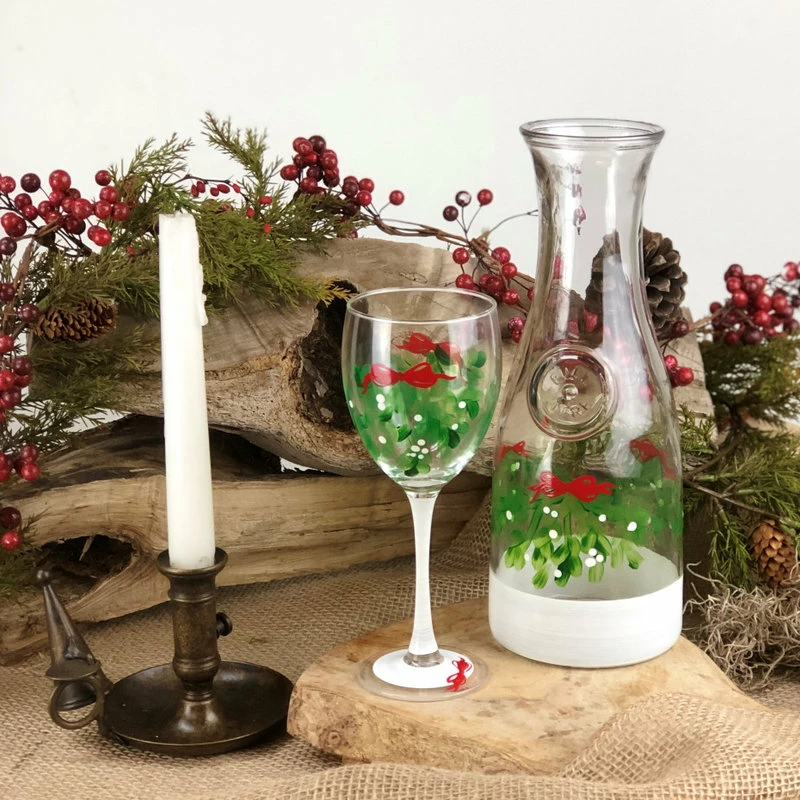 Each of our wine glasses are unique and special. Carefully and lovingly hand painted by the Artistic Team at Golden Hill Studio. Our Mistletoe Collection features pretty red berries on mistletoe branches and will make holiday celebrations very special! Put it over that special person’s head for a Mistletoe Kiss! Golden Hill Studio is not just about fine glassware but about fine living!