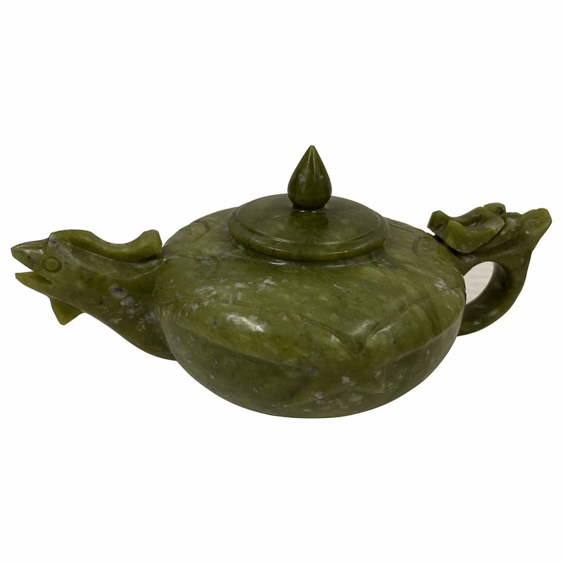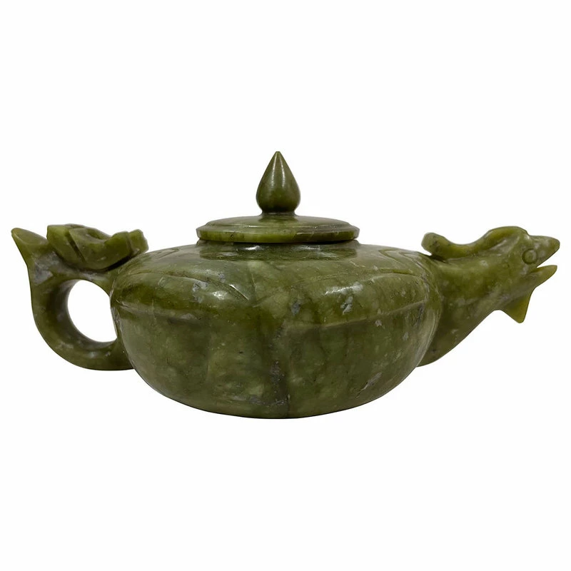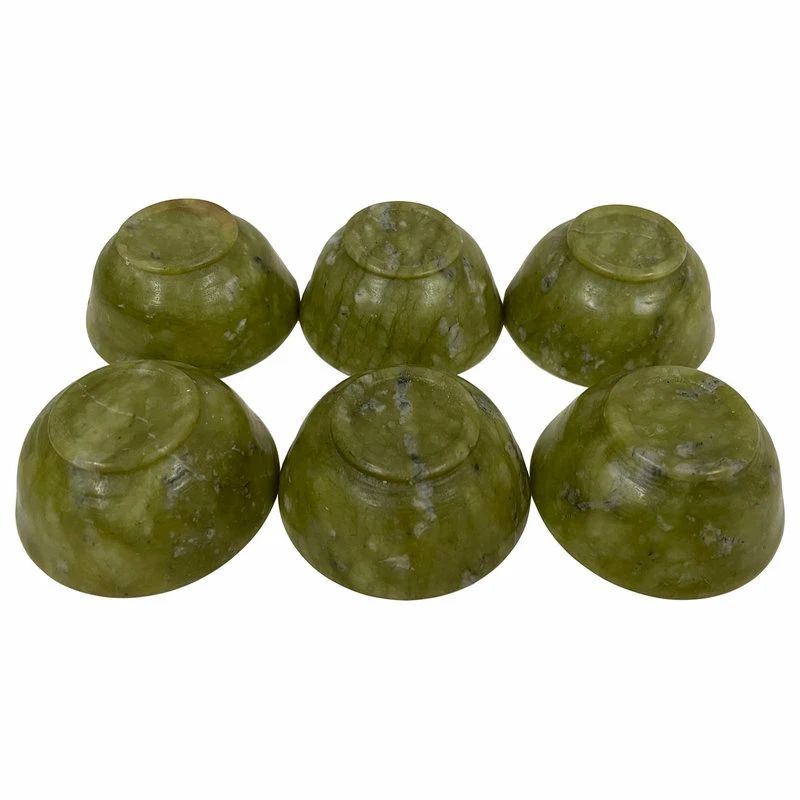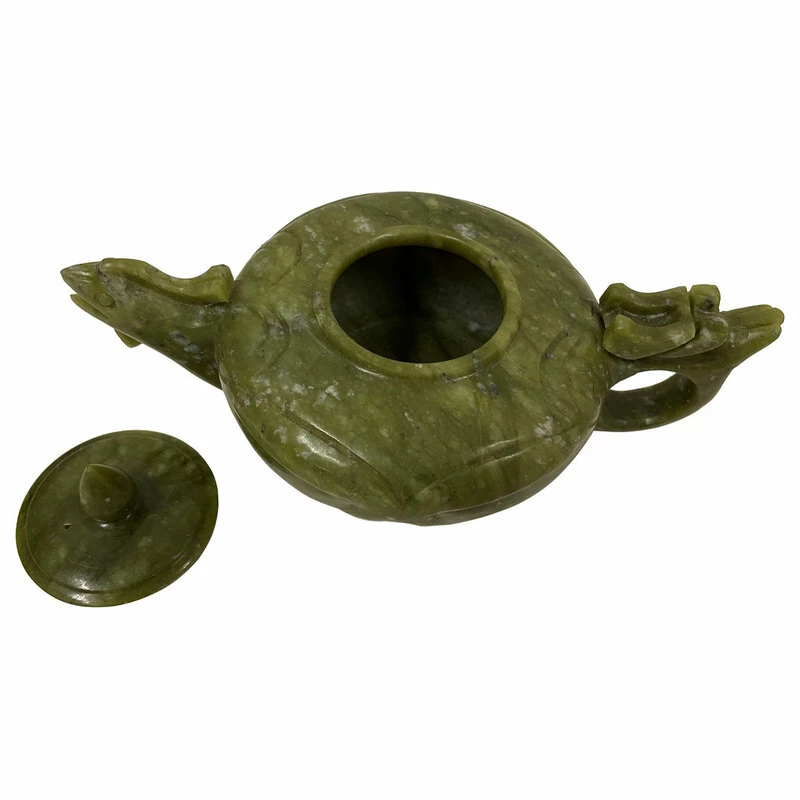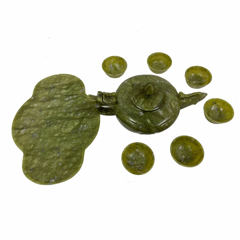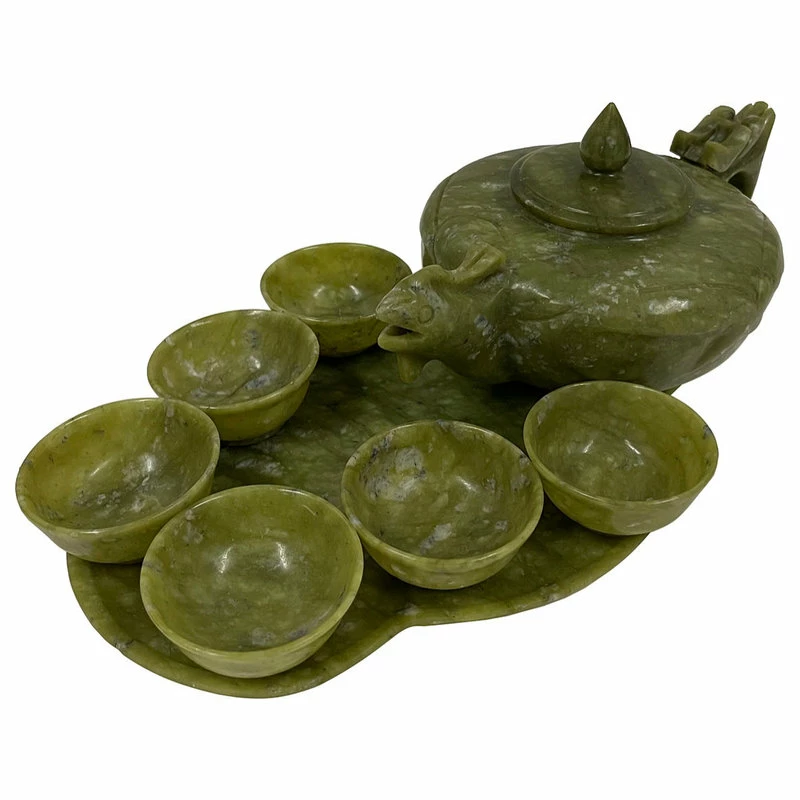 Look at this magnificent Vintage Chinese Jade tea set. It was hand made and hand carved with beautiful Chinese traditional carving works on it. It has 6 cups together with on teapot and one tea tray total 9 pieces. You can see from the pictures that it has many years history with very good vintage condition, no damages. Now you can have them on your collection shelf.