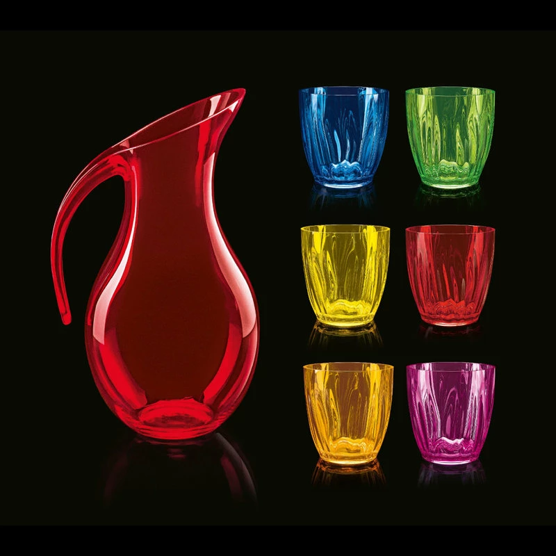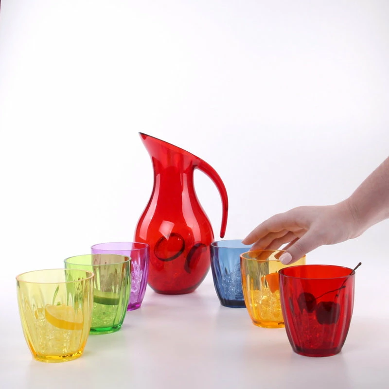 Host a party with all the essentials with the Happy Hour seven-piece multi-color drinking set from Guzzini. This set includes a 54-ounce red pitcher and six 8.5-ounce low tumblers in six different blue, green, yellow, red, orange, and purple. All pieces are made of durable transparent acrylic that is meant to be used every day. When Happy hour comes around, have colorful, playful dishware for friends and family to enjoy. Best yet, all these pieces are dishwasher safe and heat resistant to 158 degrees Fahrenheit.