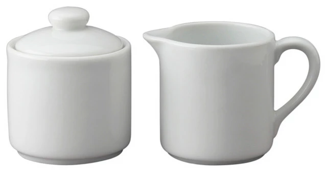 Add a dash of sweetness to your coffee or tea with this sugar and creamer set from HIC. Made of white porcelain, this set includes a creamer and sugar bowl with lid. The classic design of the set complements any decor and is ideal for everyday use or special occasions. This set is also dishwasher safe for easy clean up.
