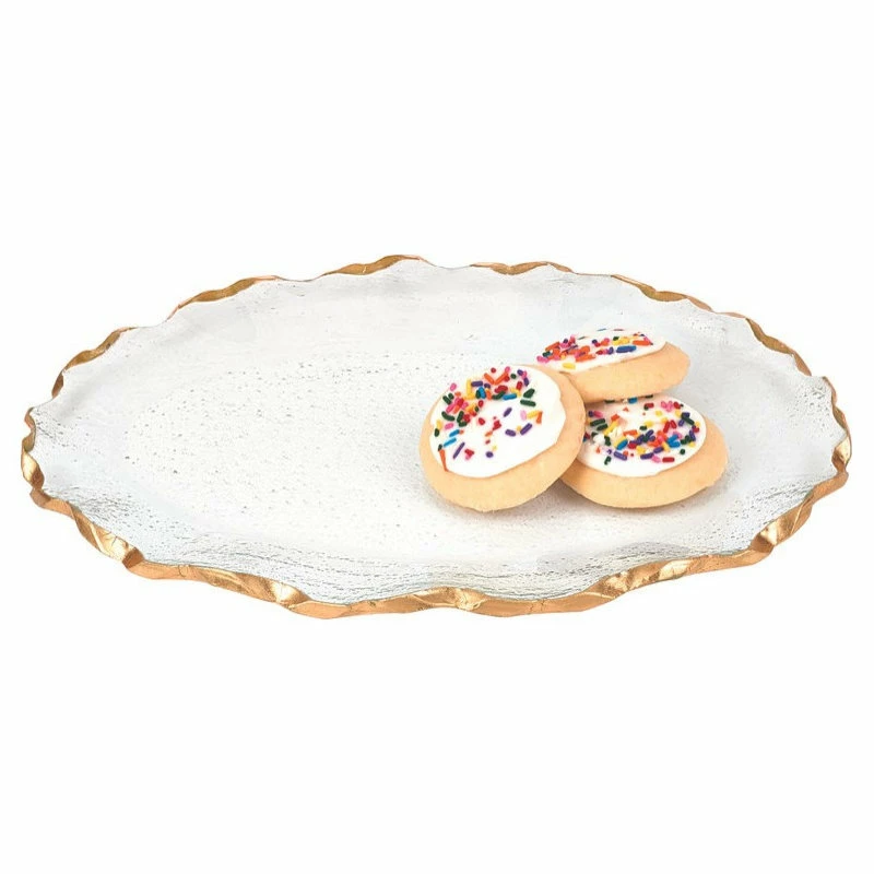 Elegant and unique design, this crafted Bubble Glass Scalloped Gold Rim Round Platter or Tray is a mix of fun color, shape and style. The bubble glass texture of this platter combines with the handpainted organically scalloped goldleaf rim to make a mix of casual and elegant that is unique and interesting. As an added bonus the sides have a slight upwards design that helps to prevent your goodies from sliding off the edge. 1″ x 10.5″ x 14″