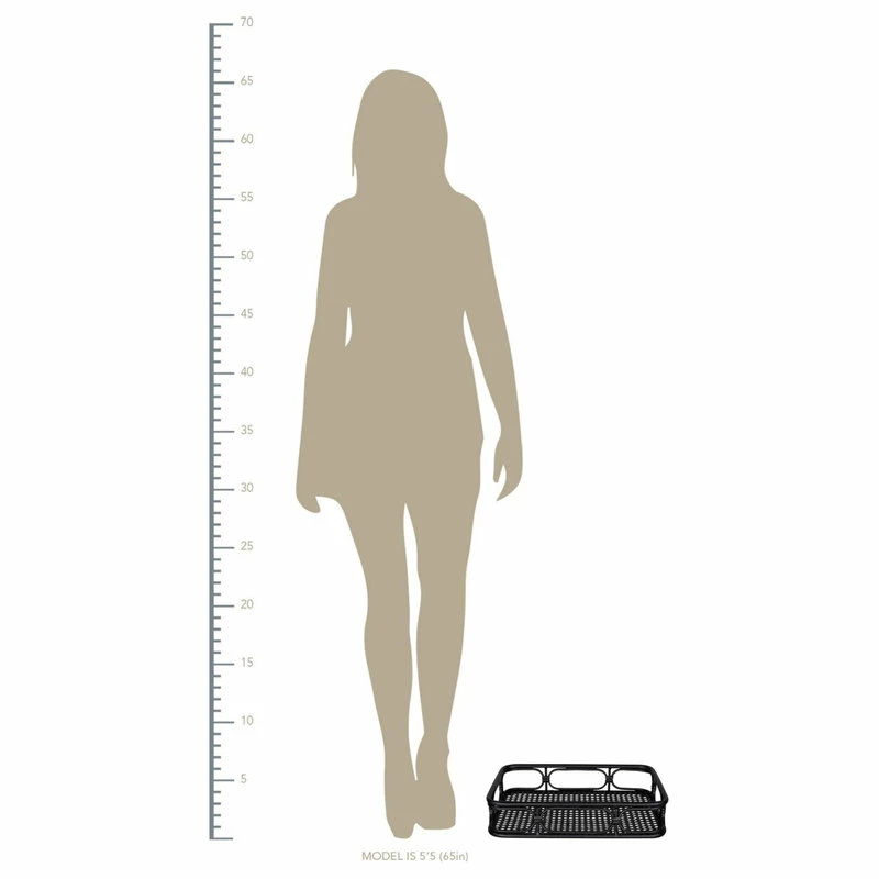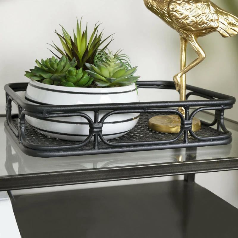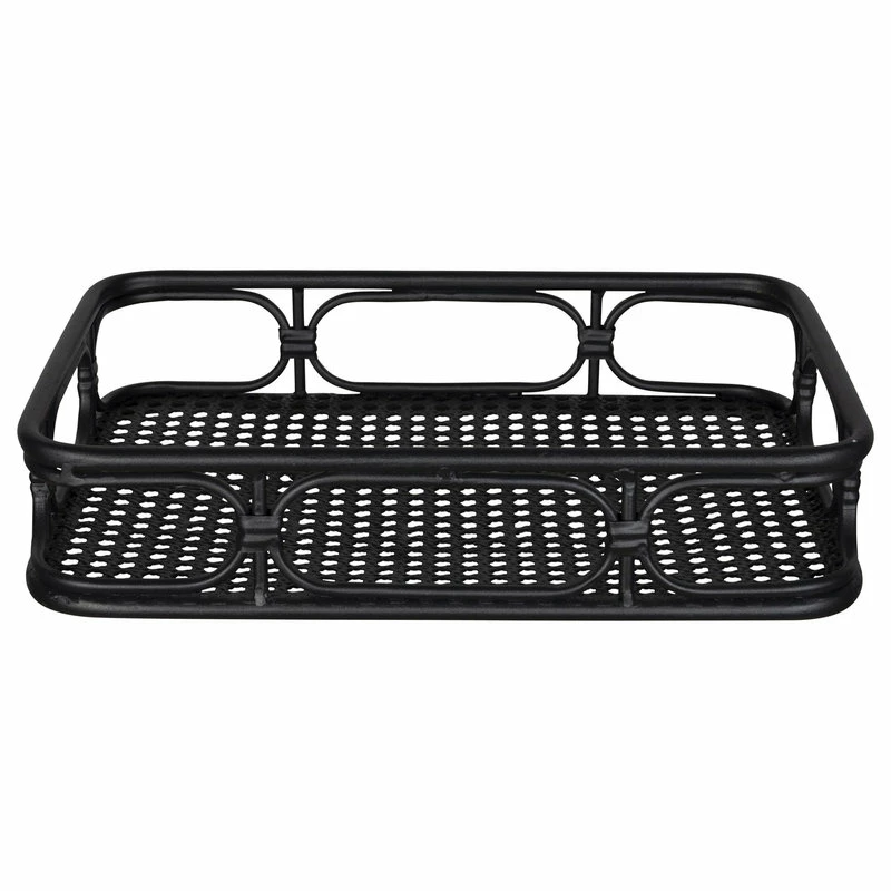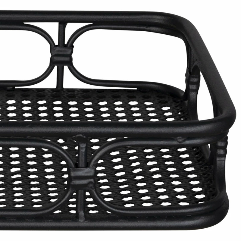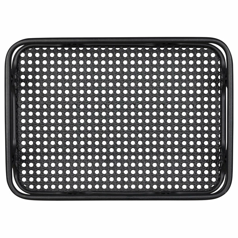 Whether serving or storing, this matte black open serving tray with a cane lattic design on the bottom is the perfect piece for the job. This tray will help keep things neat, tidy, and accessible while serving a decorative purpose, or can be used to serve and entertain. The uses are many and the look is updated and transitional in style so that it will seamlessly blend with many decors. Stable and wobble-free, this rectangular 100% metal finished in matte black is 14″ W x 10″ D x 3″ H.