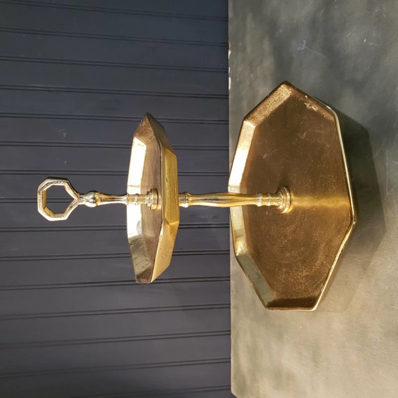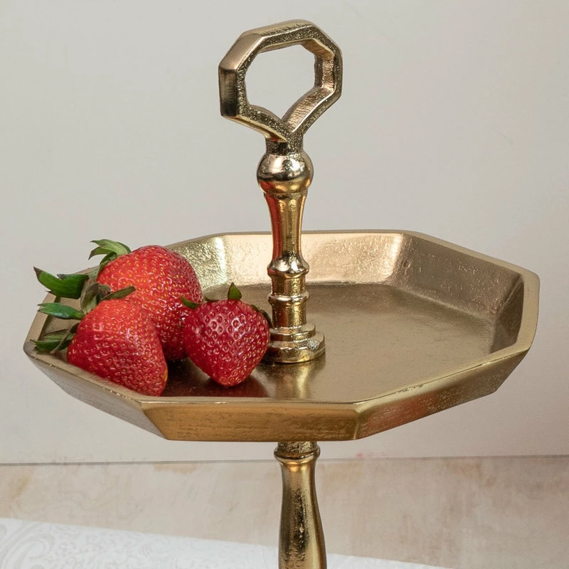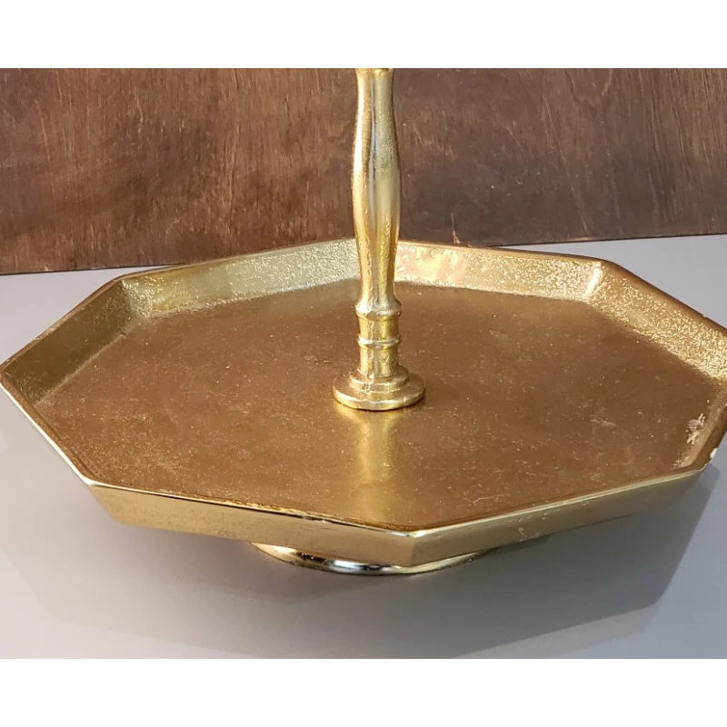 Host the perfect party with this Vintage Look Octagonal Gold Handled Tray. 14″ H, this two tiered tray with raised edges to keep items in place is both beautiful and functional. The octagon design features different sizes of graduating shelves with the largest 11″ in diameter on the bottom. Great for creating height in displays and a beautiful serving piece for buffets. Your fruit and cheese pairing will look elegant on this tiered octagon stand. The texture and distressing make this gilded gold finish handled two tier tray look vintage chic. Great for serving or to use as a centerpiece display, this tray is a work of art. These make fabulous wedding, house warming or engagement gifts. 14″ x 11″ x 11″