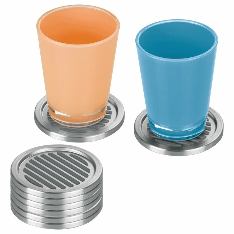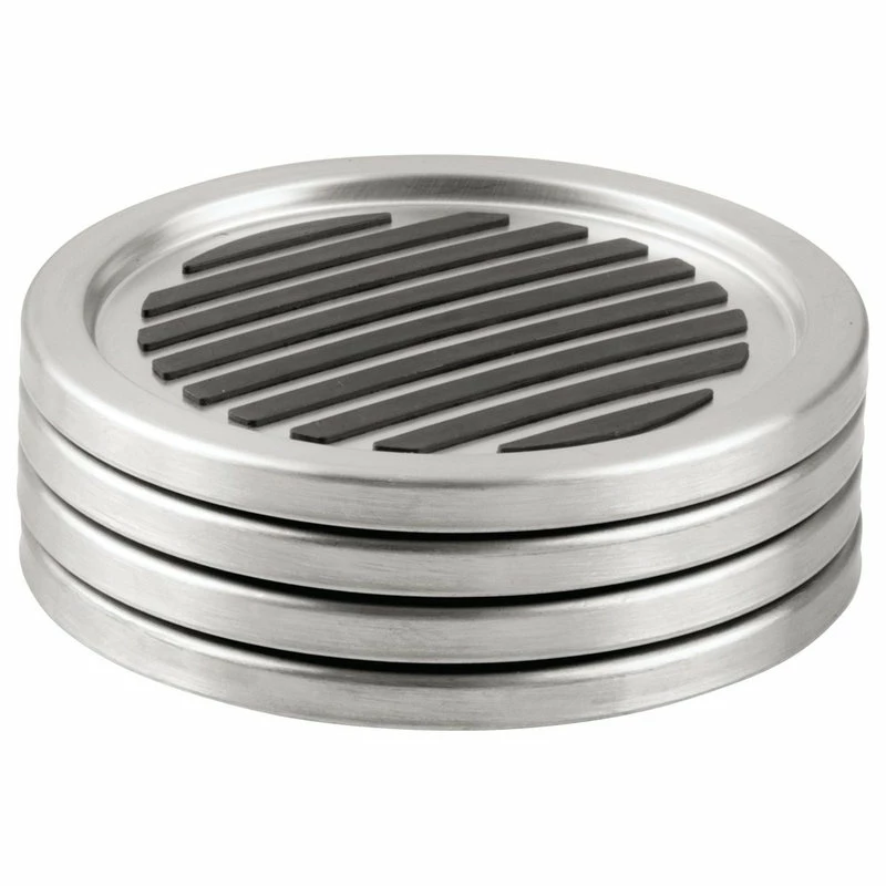 iDesign’s Forma Coasters are perfect for protecting your furniture from messy water spots! These coasters keep condensation and drips from beverages off your table and contained within the raised ridges of these stylish coasters. Made of brushed stainless steel with black accents, they are a great accent piece anywhere you use them. Each coaster measures 4.25″ wide, the perfect size for any drink.