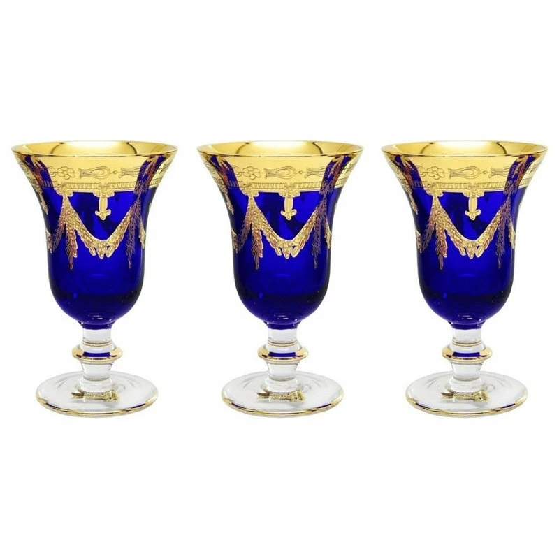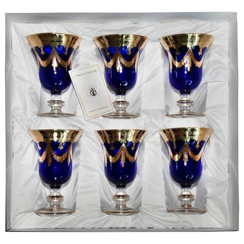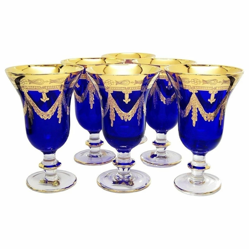 This Italian Made wine blue goblet set is made of high quality crystal with use of the “true engraving” technology. Hand-modeled goblets are solely hand-decorated with brushes to create a truly unique design, making them highly noticeable in front of mass produced machine-made competition. Engraved with bright gold and quality-controlled at every phase, these wine goblets will be an absolutely beautiful addition to your premium drink-ware set.