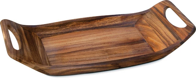 Made of environmentally friendly acacia wood, the Norwegian Saddle Tray is a beautiful addition to your coffee table or a functional piece to use to bring your sweetie breakfast in bed. Measuring 18″x9″, this piece showcases the natural aesthetic of the wood with rich, dark colors that range from gold to chocolate brown. This piece features raised edges and handles for easy transport. To clean, wash with warm, soapy water and rinse thoroughly. Do not soak.