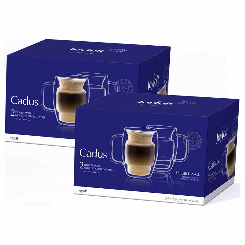 Most coffee drinkers would agree that a good cup of coffee can and should be had at any time, but they will likely also say that hot or cold coffee has a short perfect temperature life’. Hot coffee must be hot, and ice coffee must be cold. To give our dedicated coffee lovers a cup suited to their needs, we created the Cadus coffee mug to best hold the coffee’s ideal temperature. Following our Cadus design, the coffee mug in this series has a double wall application to maintain your drink’s hot temperature while protecting your hands from the heat. The set of two mugs are made of pristine hand-blown glass that can withstand a temperature of up to 350 degrees Fahrenheit; this heat can be from the microwave, the liquid itself, a dishwasher or even an oven! Similarly, our Cadus mugs are freezer safe, allowing hot coffee to be turned iced without having to change cups! By using only top-quality borosilicate-glass for our mugs, we are able to give our customers durability, functionality and style all in one. Our Cadus tea mugs are must-have additions to your cabinets that, at JoyJolt, we know will significantly improve your coffee drinking experiences.
