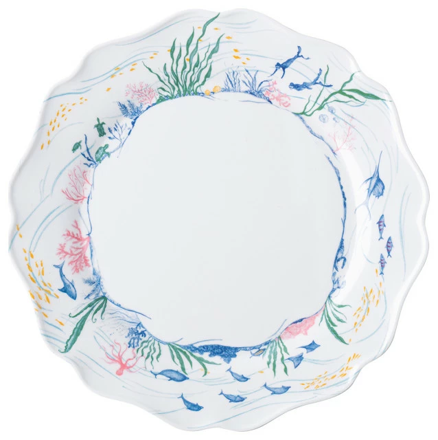 New for the Country Estate lover featuring idyllic Seaside scenes! Dive into the crisp water and explore the animal and plant life on the band of this scalloped melamine dinner plate. Pack a stack of these plates for a beachside picnic or bring them out to the patio for an impromtu dinner date under the stars.