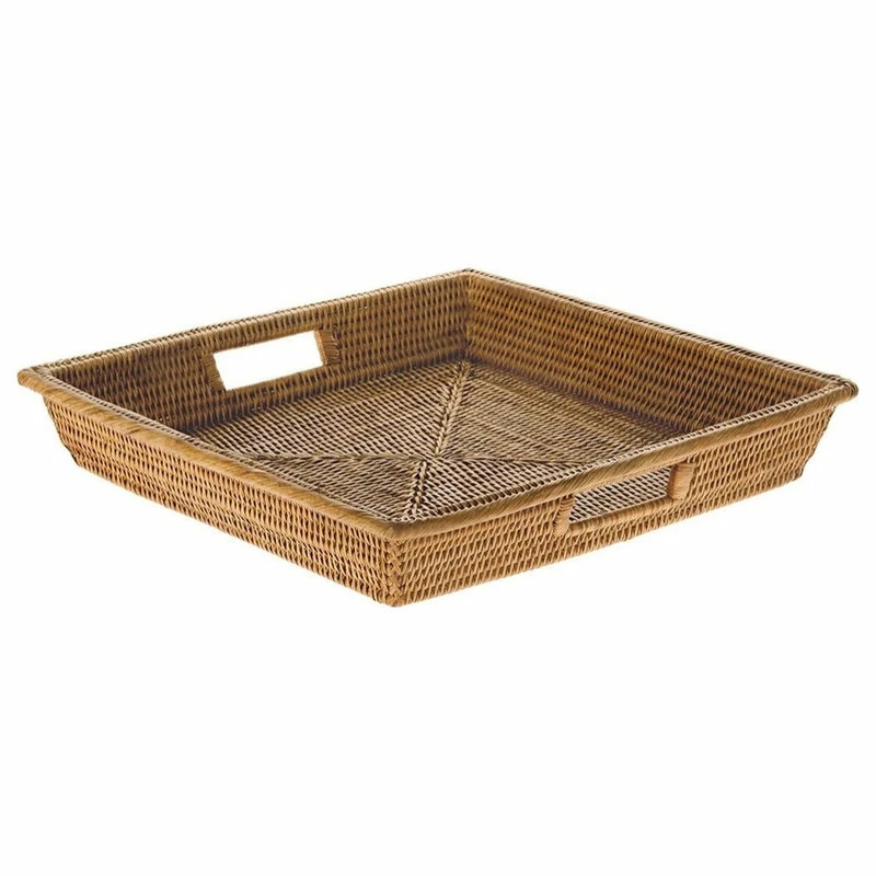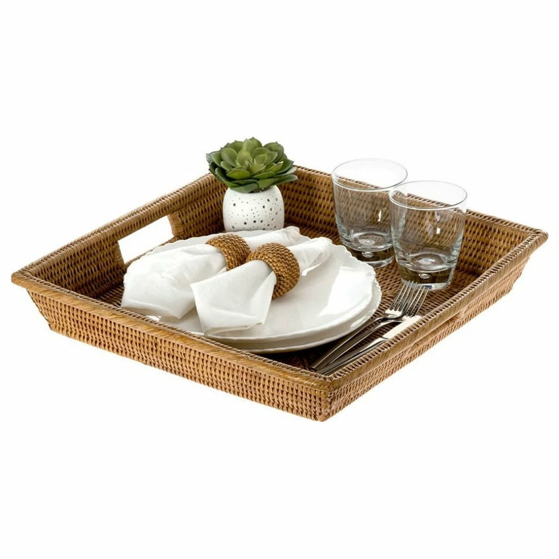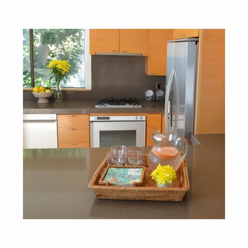 The color of honey-brown, this rattan-rimmed serving tray will reflect your most refined tastes. Perfect for the table, a decorative accent on a tabletop, or to carry breakfast in bed to your favorite person.