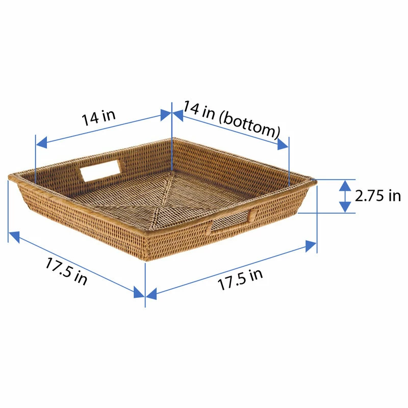 - 17.5 inches long x 17.5 inches wide x 2.75 inches high. Bottom 14 inches x 14 inches.