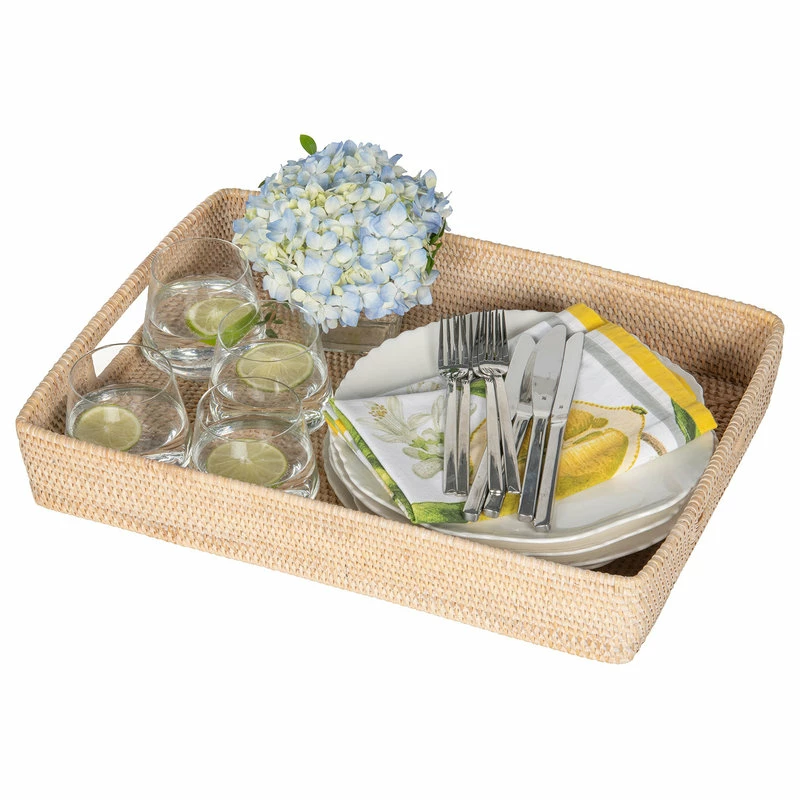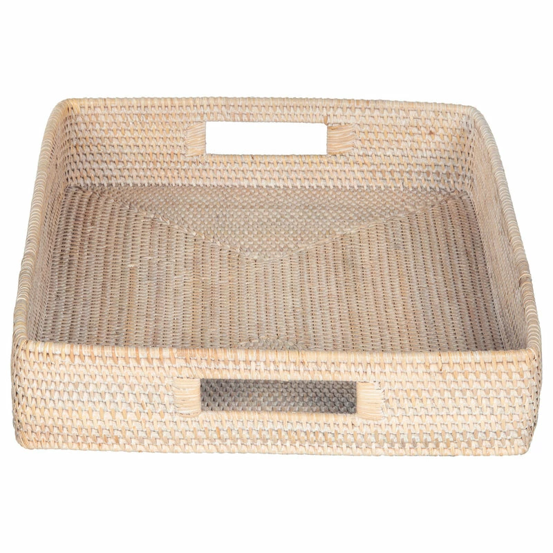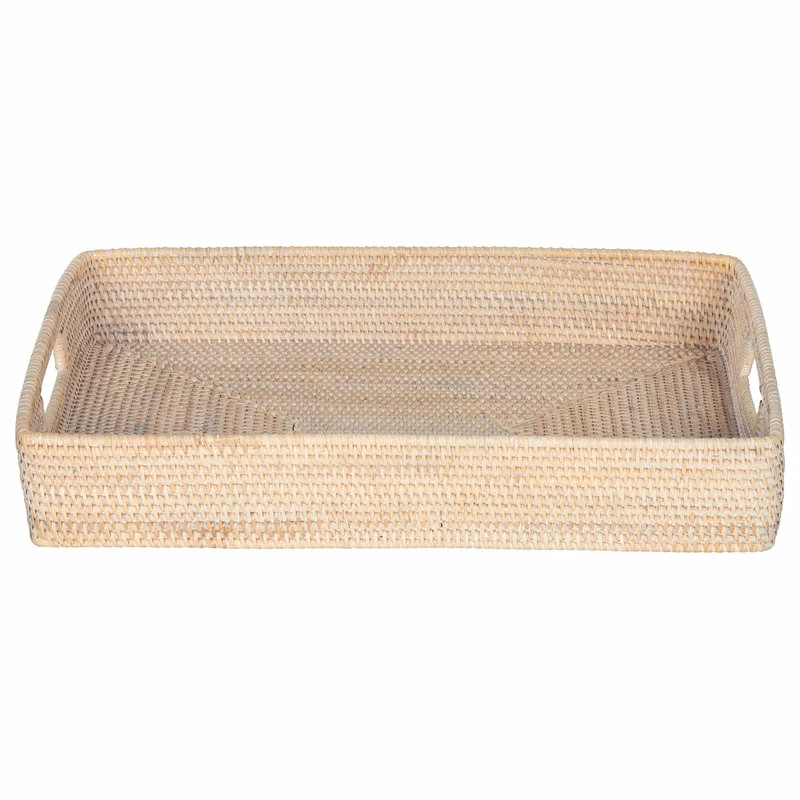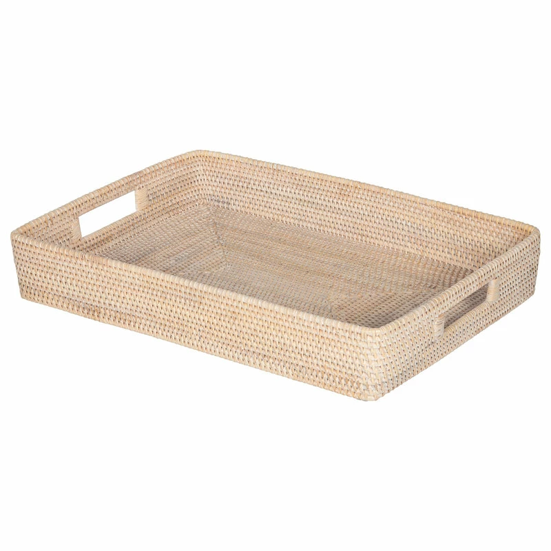This serving tray is reminiscent of the piece of driftwood you found on the shore during your last trip to the coast. Hand woven from rattan, this serving tray in a cool, coastal white wash finish will serve as a pretty backdrop and useful helper for your favorite table setting.