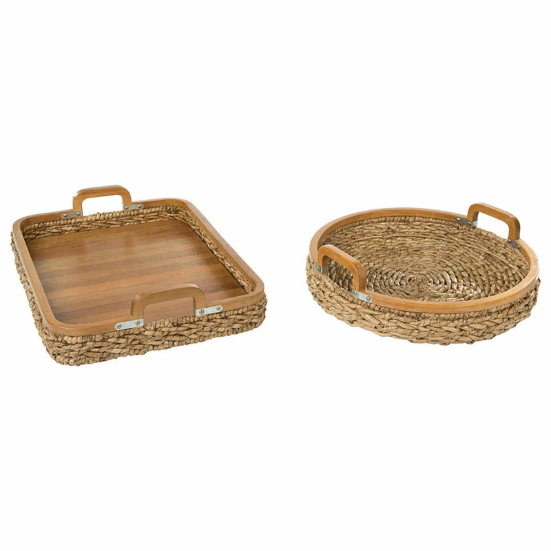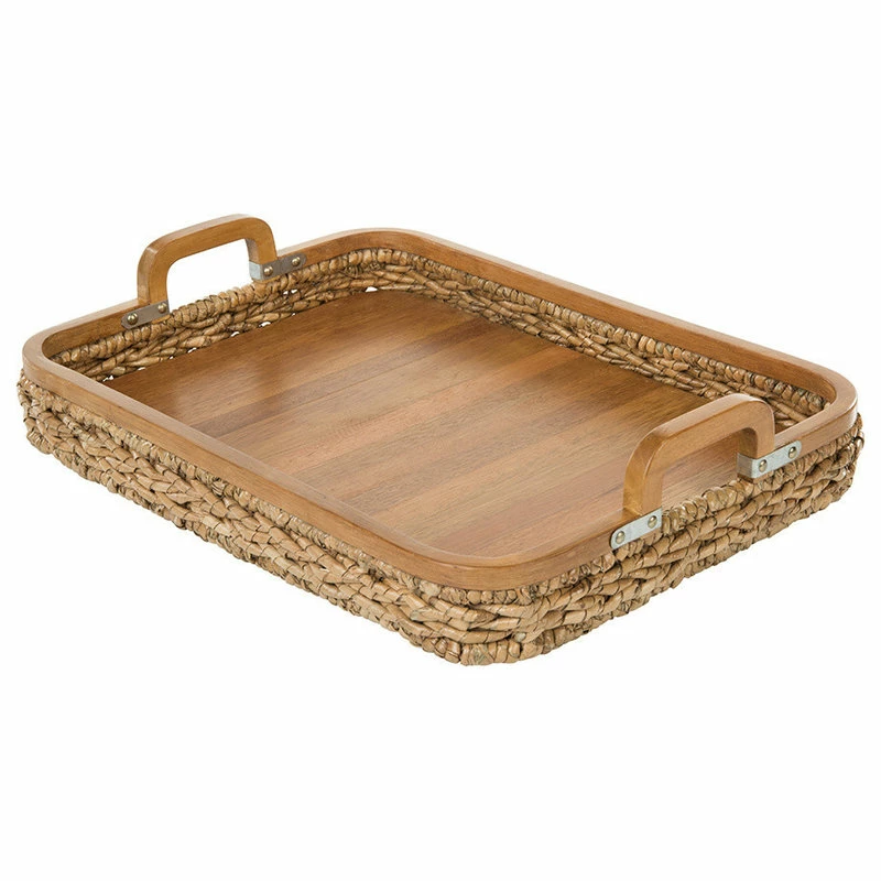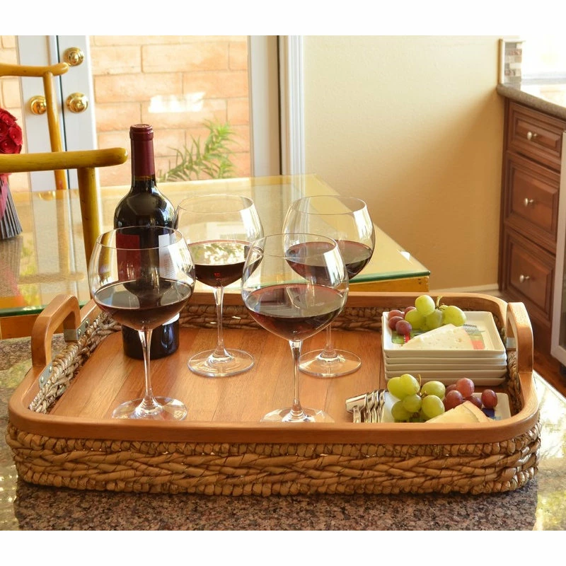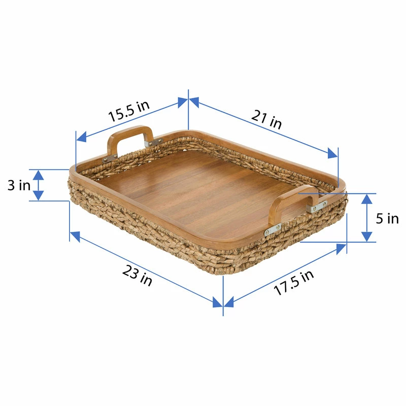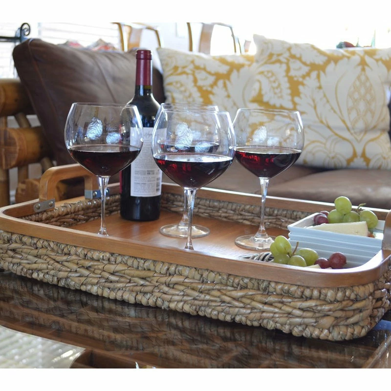 This seving tray is an elegant yet sturdy decorative piece to carry your tableware and stem wine glasses from the kitchen to the dining table. The wood bottom provides a flat surface to balance delicate glass and porcelain from place to place. And the combination of the twisted sea grass with the wood handles also make it an ideal centerpiece on your ottoman or coffee table.