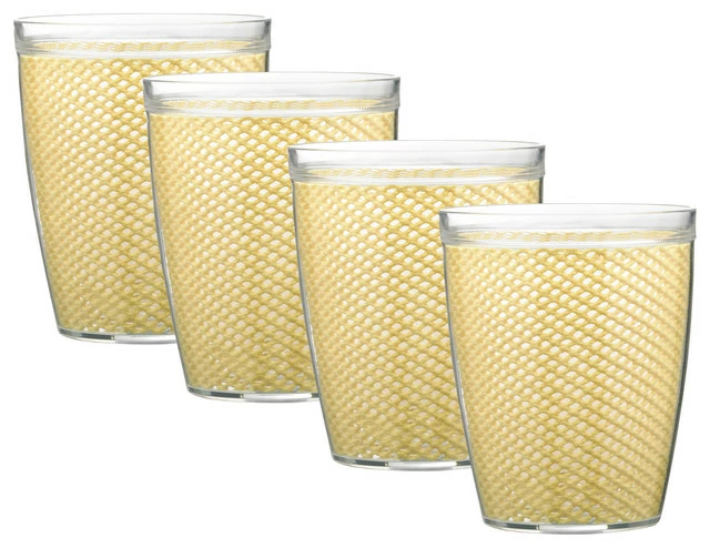The Kraftware Fishnet Double Wall Glasses make a stylish, practical addition to a modern kitchen. Made from durable AS plastic, these 14-ounce glasses feature double-walled construction and sonic welding for premium insulation and zero condensation. An ivory fishnet interior lining gives the glasses a fun, unique look. Dishwasher safe (top rack only). Set of 4.