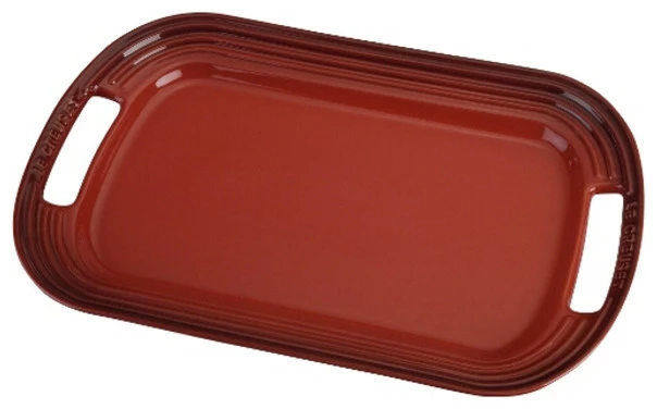 Serve your guests in style with this Le Creuset oval serving platter. Made from Cerise Cherry stoneware, it is long lasting and durable. With a high-quality exterior enamel coating to protect it against scratches, marks, and other damage, it is odor and stain resistant and features two helper handles. Heat resistant to 500 degrees Fahrenheit, this platter is also oven, microwave, broiler, and freezer safe. It provides ample space for serving appetizers, roasts, main and side dishes, sandwiches, and more, and is dishwasher safe, making cleanup a breeze.