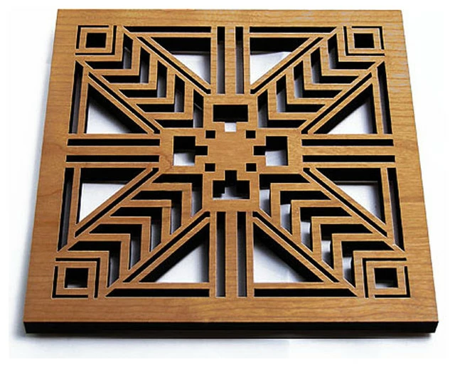 The Frank Lloyd Wright Robie Sconce Hardwood Trivet design is adapted from wall sconces found in the Frederick Robie House (1908) in Chicago, Illinois. Precision laser cut wood for quality of finish and design accuracy. Comes with sawtooth hanger for (optional) wall display. Dimensions: 7.75″ x 7.75″ x .5″.