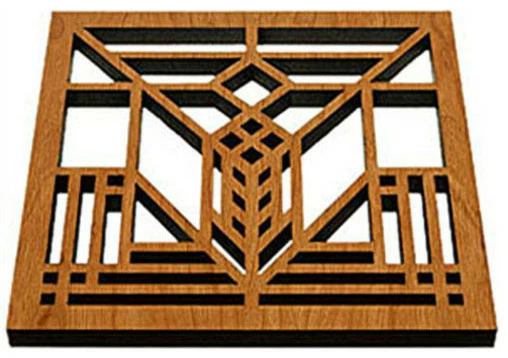 The Frank Lloyd Wright Lake Geneva Trivet design is adapted from art glass windows originally found in the now demolished Lake Geneva Inn, Lake Geneva, Wisconsin 1911. Precision laser cut wood for quality of finish and design accuracy. Comes with sawtooth hanger for (optional) wall display. Cushioned feet. Dimensions: 7.75″ x 7.75″ x .5″.