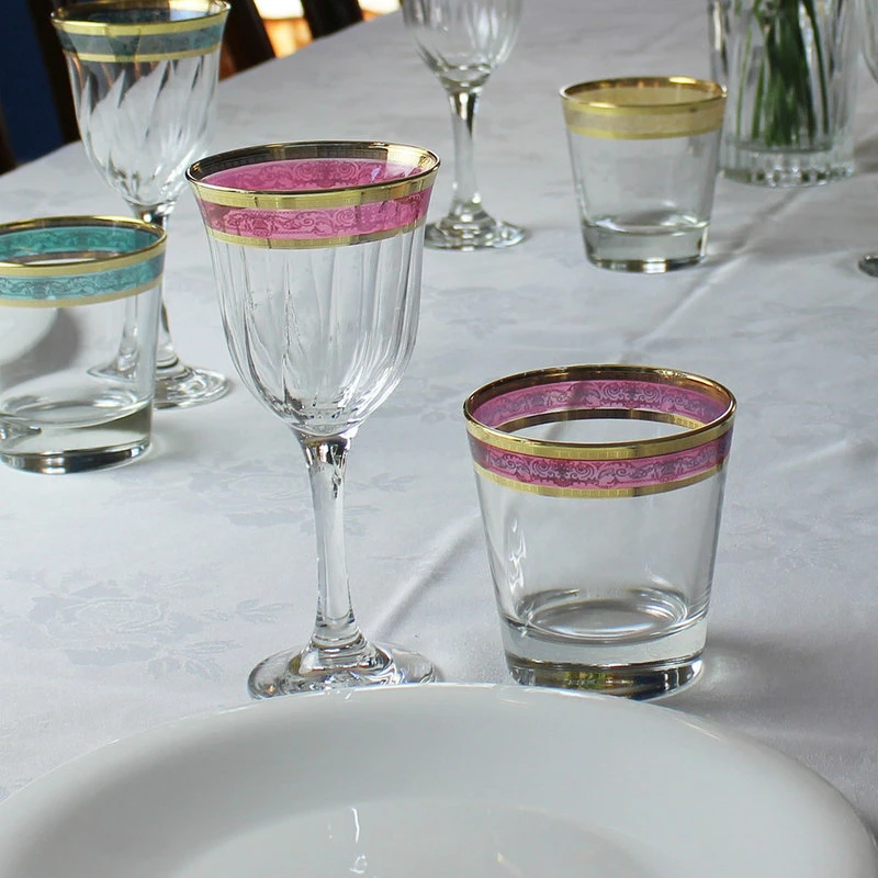 Made to use with your favorite glass of wine, the Melania Collection features a swirled bowl on a stemmed glass. The thick band of pastel colors is surrounded by gold rim of intricate box shapes. This set includes 6 colors: Amber, Blue, Green, Pink, Purple, and Smoke. Each glass is carefully crafted by expert Italian designers. This glass measures 3.5 x 3.5 x 7.75 and holds 9 ounces.