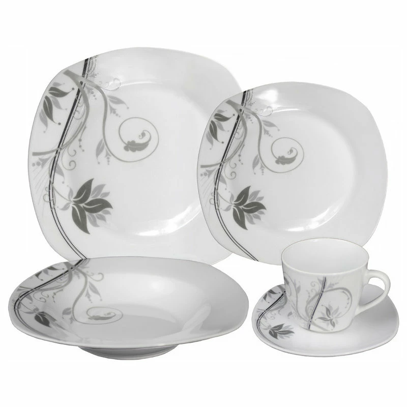 20 Piece Porcelain Square Dinnerware Set, service for 4. This elegant and stylish set is made of durable porcelain. Set includes 4-10.5″ dinner plate, 4-9″ Soup bowl, 4-8″ Salad plate, 4-6 ounce coffee cup and 4-saucers. Fun designs for entertaining and dining. Dishwasher and Microwave Safe.