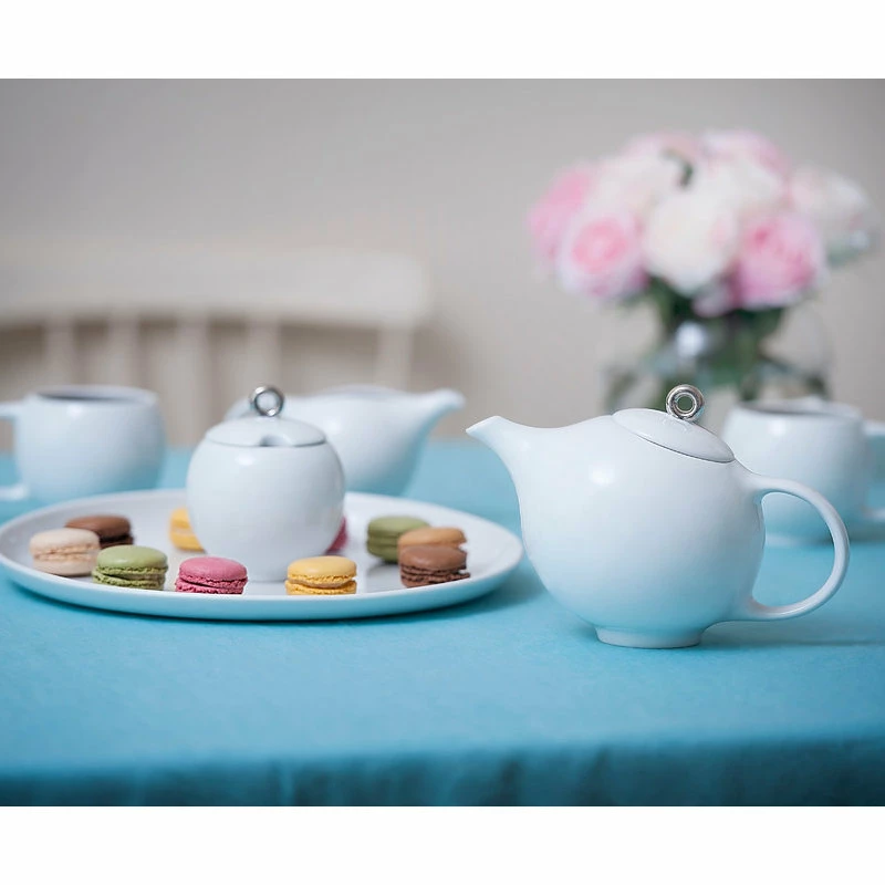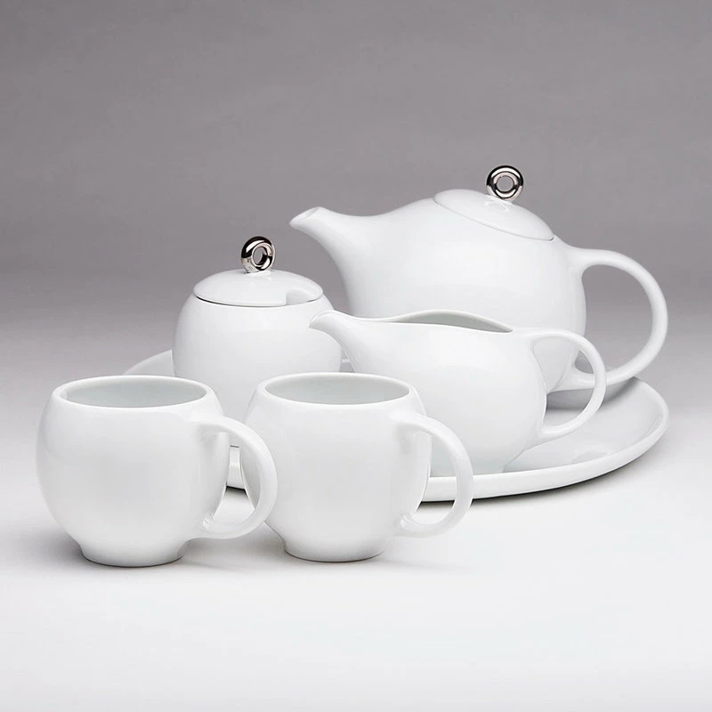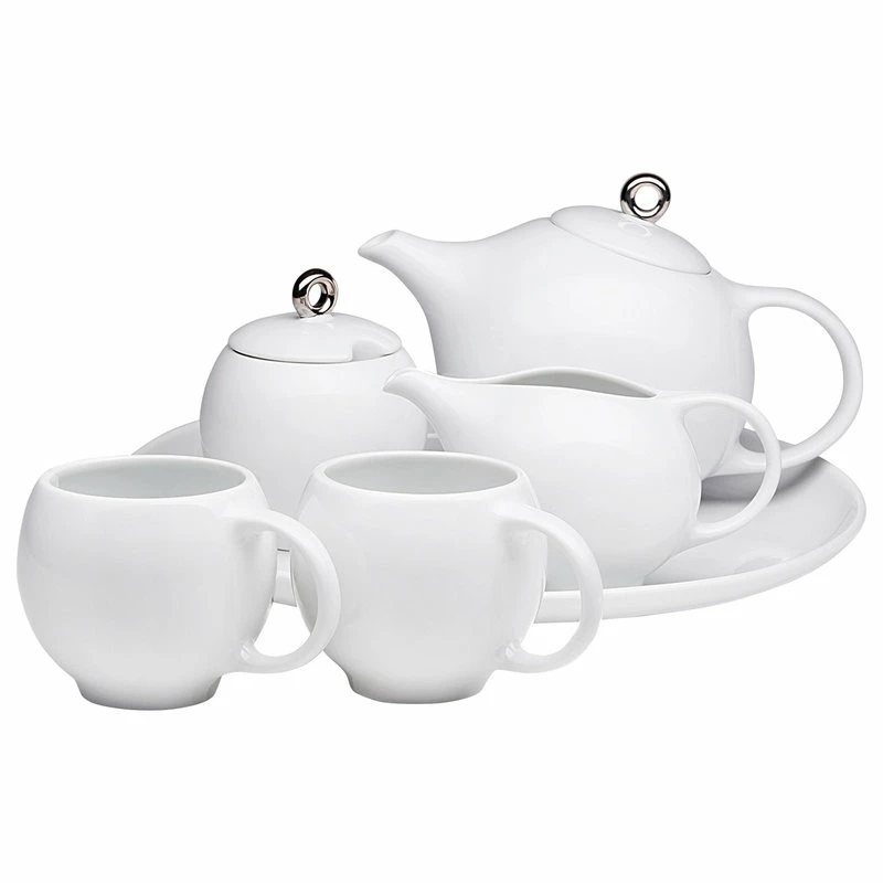 Enjoy the complete EVA teaset in glossy white porcelain. Each piece is thoughtfully designed to enhance the senses at teatime. Includes a teapot, 2 teacups, milk pitcher, sugar bowl, and serving platter.