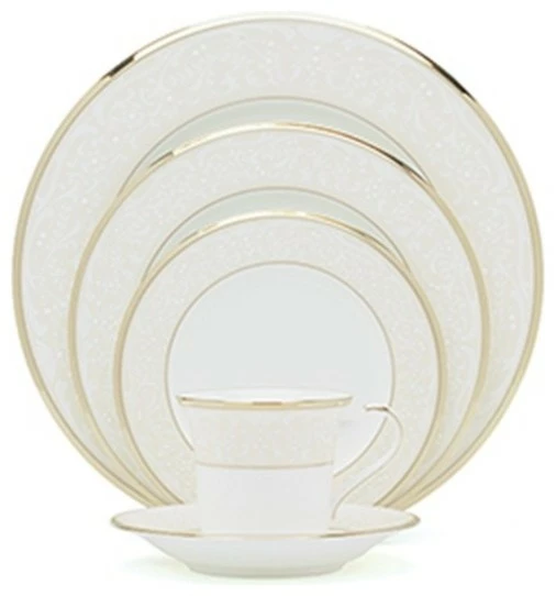Noritake White Palace features white a raised floral and generously applied enamel dots on a soft beige background with lavish gold banding on white china. Crafted of Noritake fine china with a gold band.