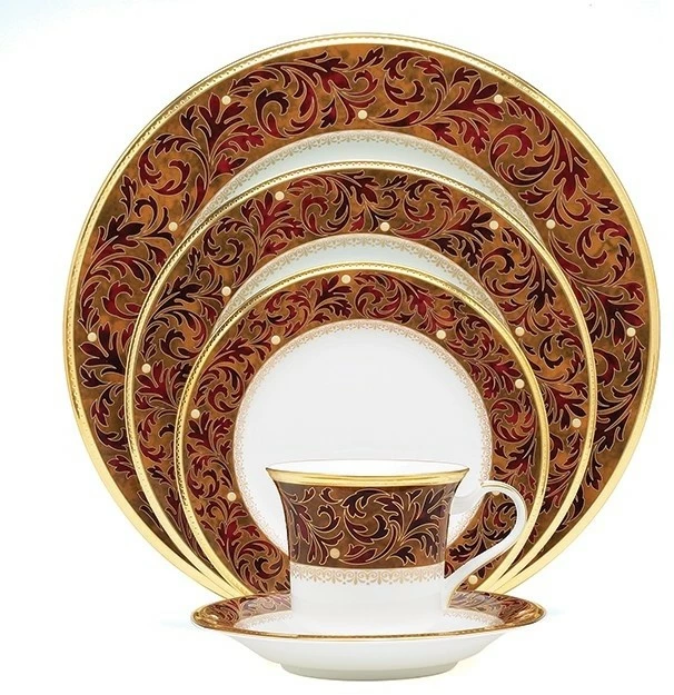 Noritake Xavier Gold features a full band of leafy swirls in rich colorations of burgundy laid over a brown background with generously applied raised enamel dots. Edged in gold, it has a look of dramatic elegance. Crafted of white china with a gold band.