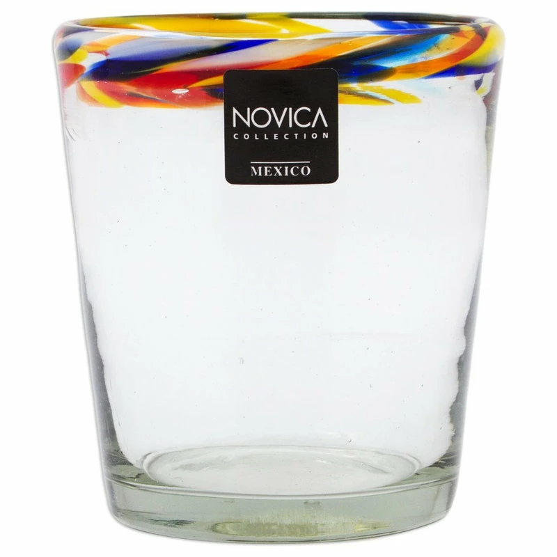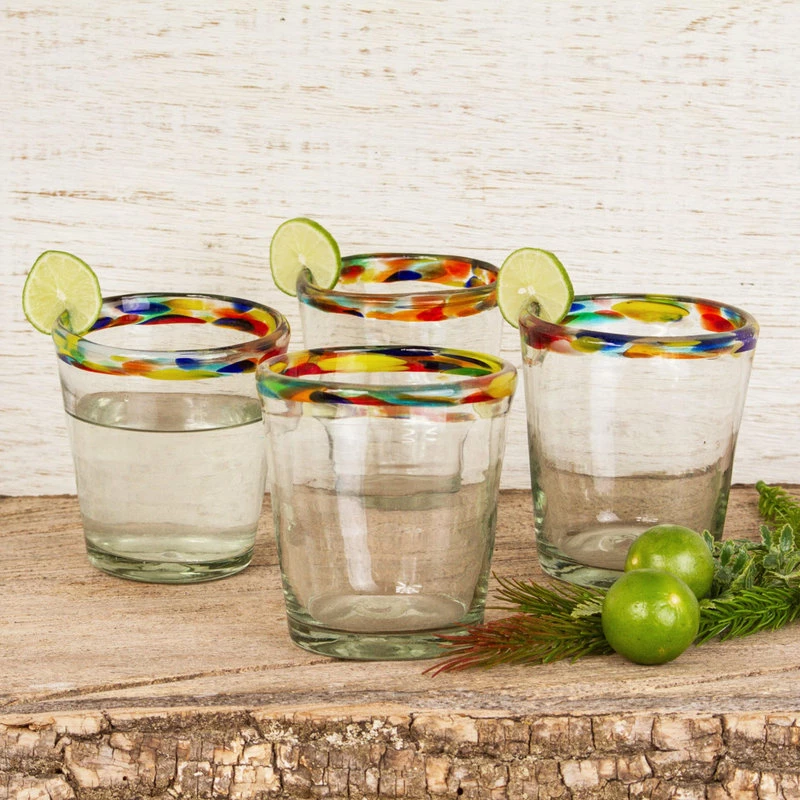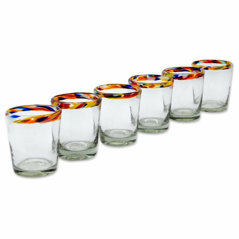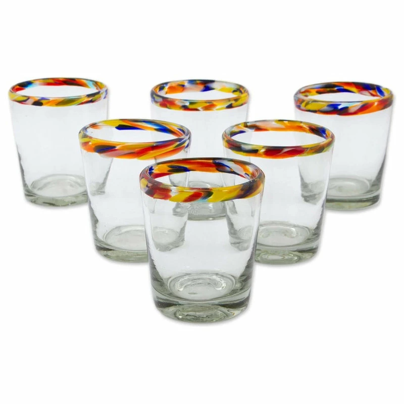 These juices glasses from Mexico are literally brimming with festive energy. The modern design of the glasses is by Javier and Efr’n, and each one is individually crafted with centuries-old blown glass techniques. The glass blower’s expertise is evident as he masterfully creates the illusion of colorful floating confetti.